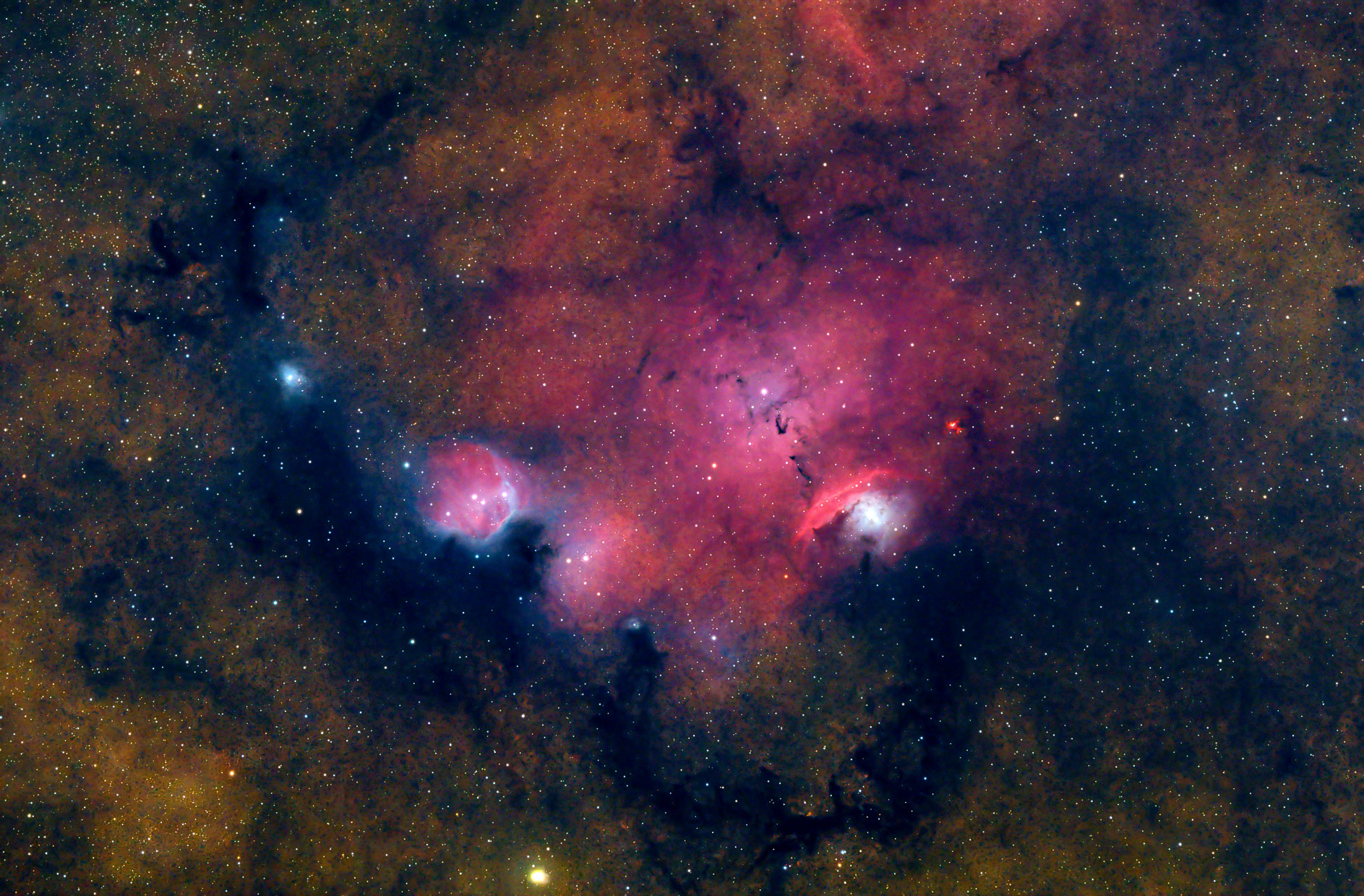 Im Nordwesten des Schützen findet man den Trifid-Nebel, ein Standard Objekt für jeden Astrofotografen. Er ist eine Kombination aus Sternentstehungsgebiet, HII Region, Reflexionsnebel und Dunkelnebel. In der linken, oberen Ecke ist noch der Sternhaufen M 21 im Bild. Trotz geringer Höhe, schlechter Transparenz durch Saharastaub und 77 % Mondphase IMHO ganz brauchbar.