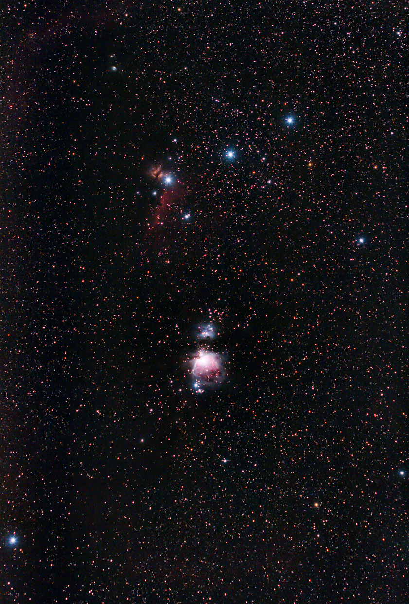 Gürtel und Schwert des Orion mit Canon 1000da, EF 2.8/100 auf 4.0 abgeblendet. 3 Aufnahmen a 60 sec. ISO 800, wegen aufkommender Bewölkung Belichtungsserie abgebrochen.