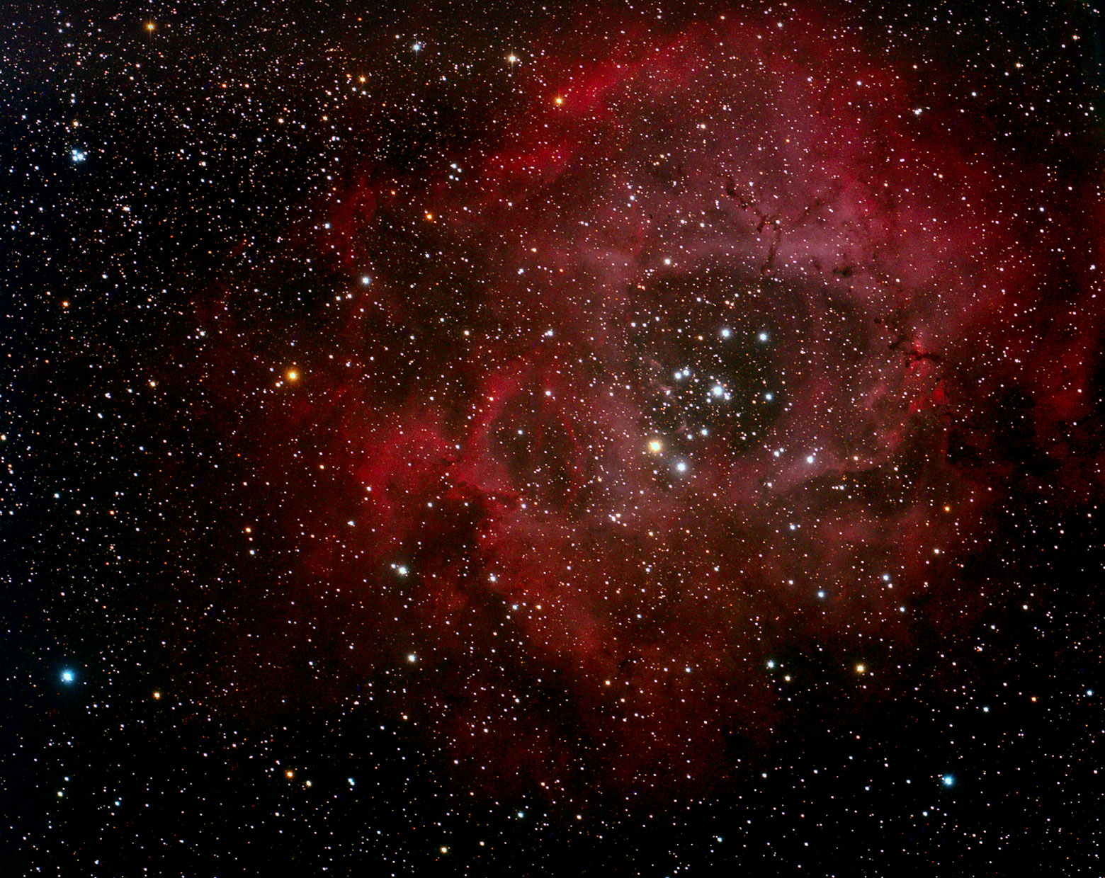Caldwell 49 und NGC 2244 - Der offfene Sternhaufen NGC 2244 im Zentrum des Rosettennebel (C49). Veloce RH200, Canon 1000da, 19 x 3 min., ISO 800, wechselnde Transparenz durch Cirruswolken