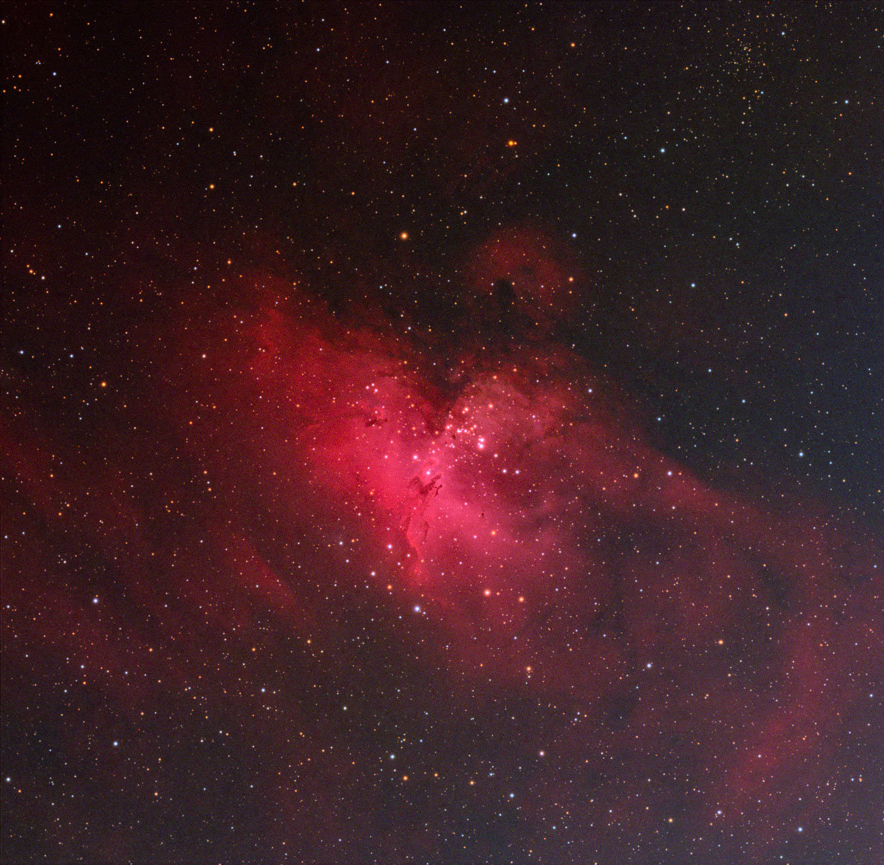 M 16, der Adler Nebel im Schwanz der Schlange (Serpens Cauda).. Ein offener Sternhaufen mit Emissionsnebel, M 16 wird meistens synonym für beide gebraucht, offiziell hat der Nebel die Bezeichnung IC 4703.