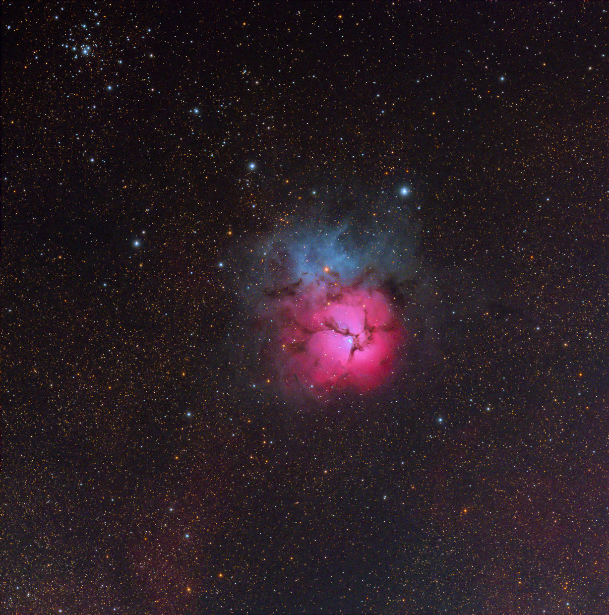 Im Nordwesten des Schützen findet man den Trifid-Nebel, ein Standard Objekt für jeden Astrofotografen. Er ist eine Kombination aus Sternentstehungsgebiet, HII Region, Reflexionsnebel und Dunkelnebel. In der linken, oberen Ecke ist noch der Sternhaufen M 21 im Bild. Trotz geringer Höhe, schlechter Transparenz durch Saharastaub und 77 % Mondphase IMHO ganz brauchbar.
