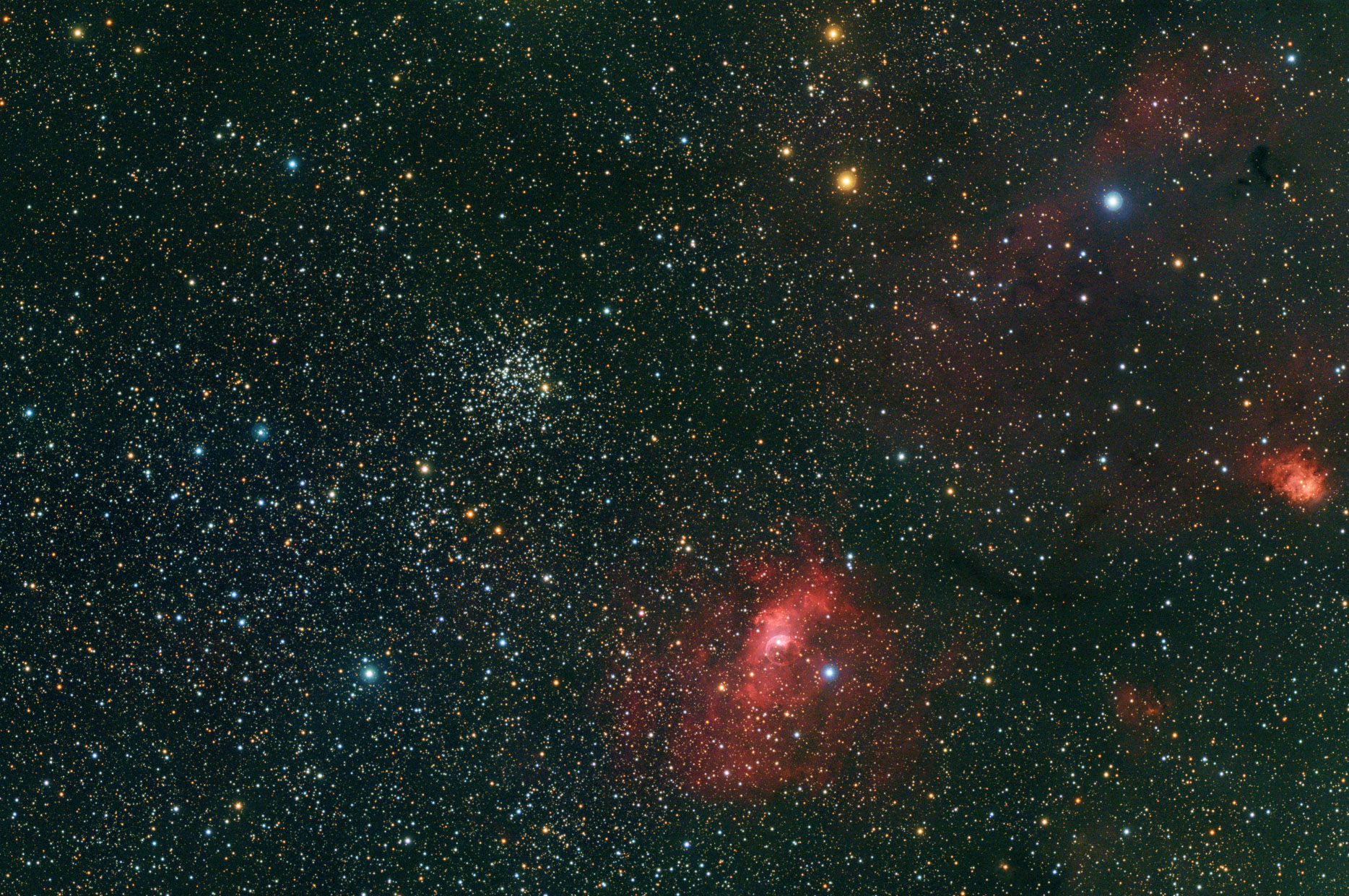 Messier 52 ist ein offener Sternhaufen im Sternbild Kassiopeia, er liegt in der Nachbarschaft von NGC 7635, dem "Bubble Nebula". Am rechten Bildrand ist NGC 7538.