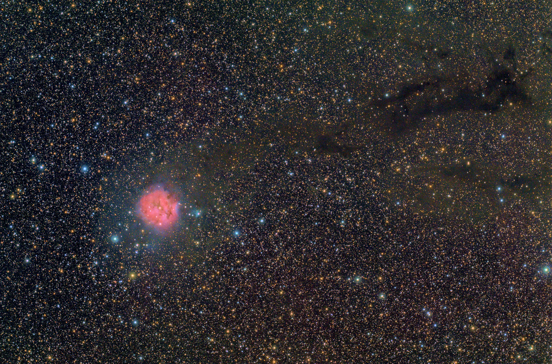Sh2-125 oder Caldwell 19 aka Cocoon Nebula ist ein Reflektions- und Emissionsnebel im Schwan. Im Bild ist die Dunkelwolke B 168 untrennbar vom Nebel und formt eine Spur nach Westen. Bei manchen Autoren findet man auch die Bezeichnung "Dunkle Zigarre".