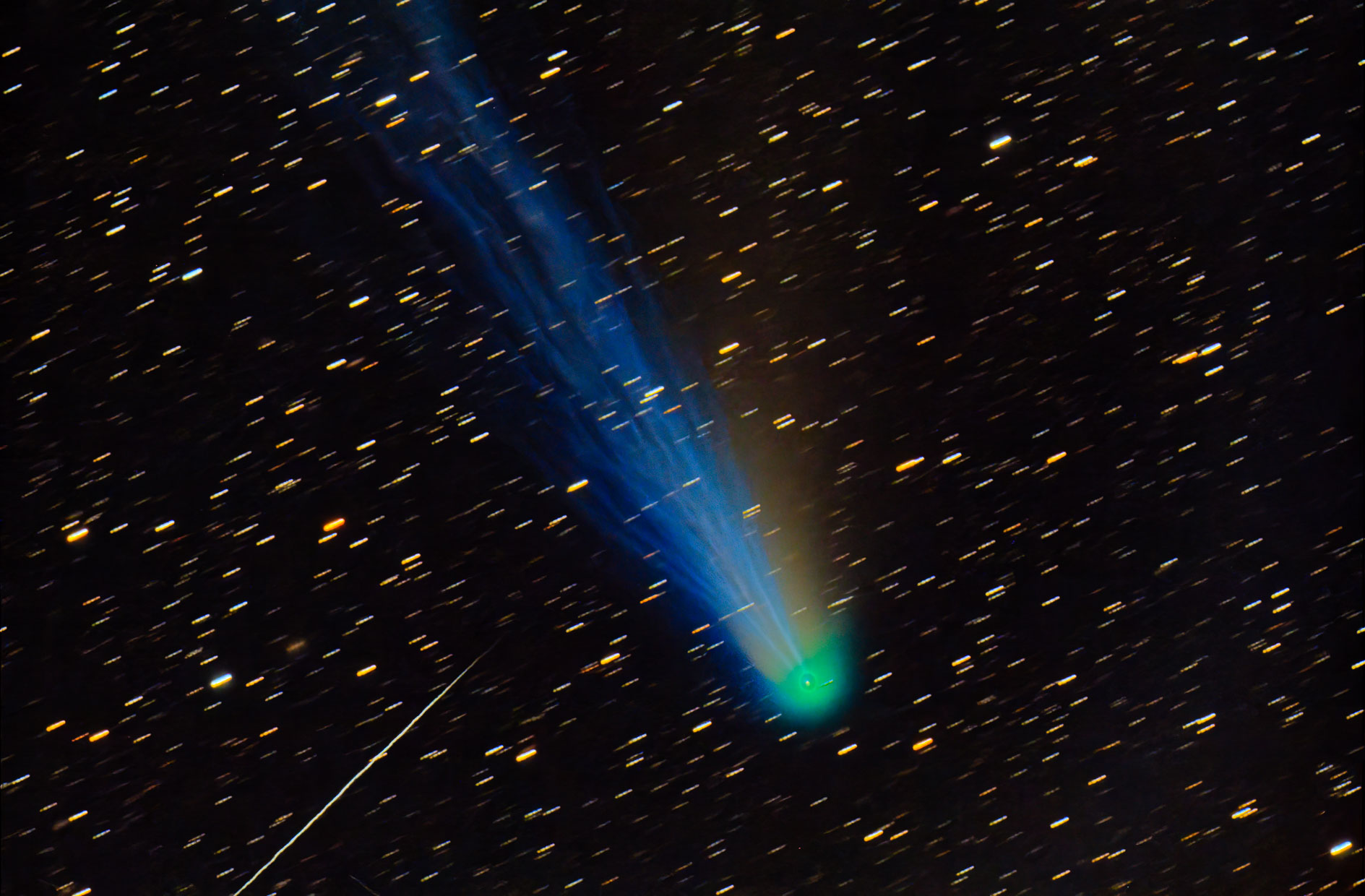 Der Komet 12P/Pons-Brooks und ein Meteor. Benannt nach seinen Erstentdeckern Jean-Louis Pons 1812 und William Robert Brooks 1883 bewegt der Komet sich gegenwärtig durch das Sternbild Widder und dürfte aktuell eine Helligkeit von 4mag5 haben.