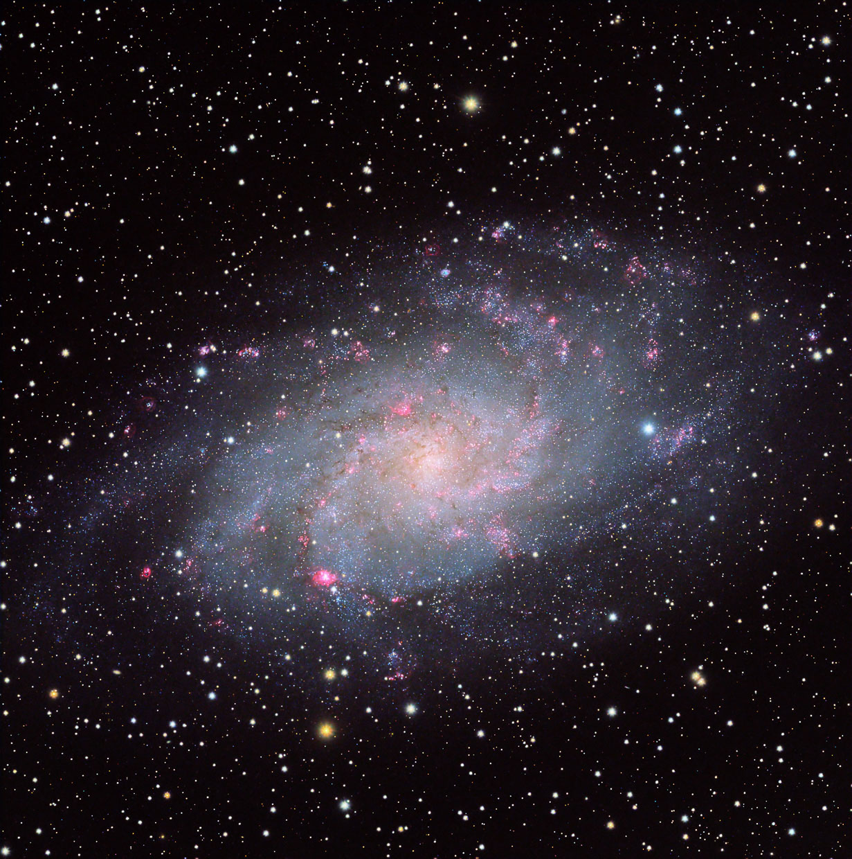 M 33, die Dreiecks Galaxie, ist die kleinste Spiralgalaxie in der Lokalen Gruppe und ca. 2,73 Millionen Lichtjahre von der Milchstraße entfernt. Sie wurde wahrscheinlich schon vom italienischen Astronom G. B. Hodierna 1654 entdeckt und beschrieben. Aufnahmedaten: Veloce RH200, ASI 533 MM, 30 x 120 s L, jeweils 10 x 120 s R, G und B und 10 x 300 s Halpha. Bearbeitung mit PI und PS