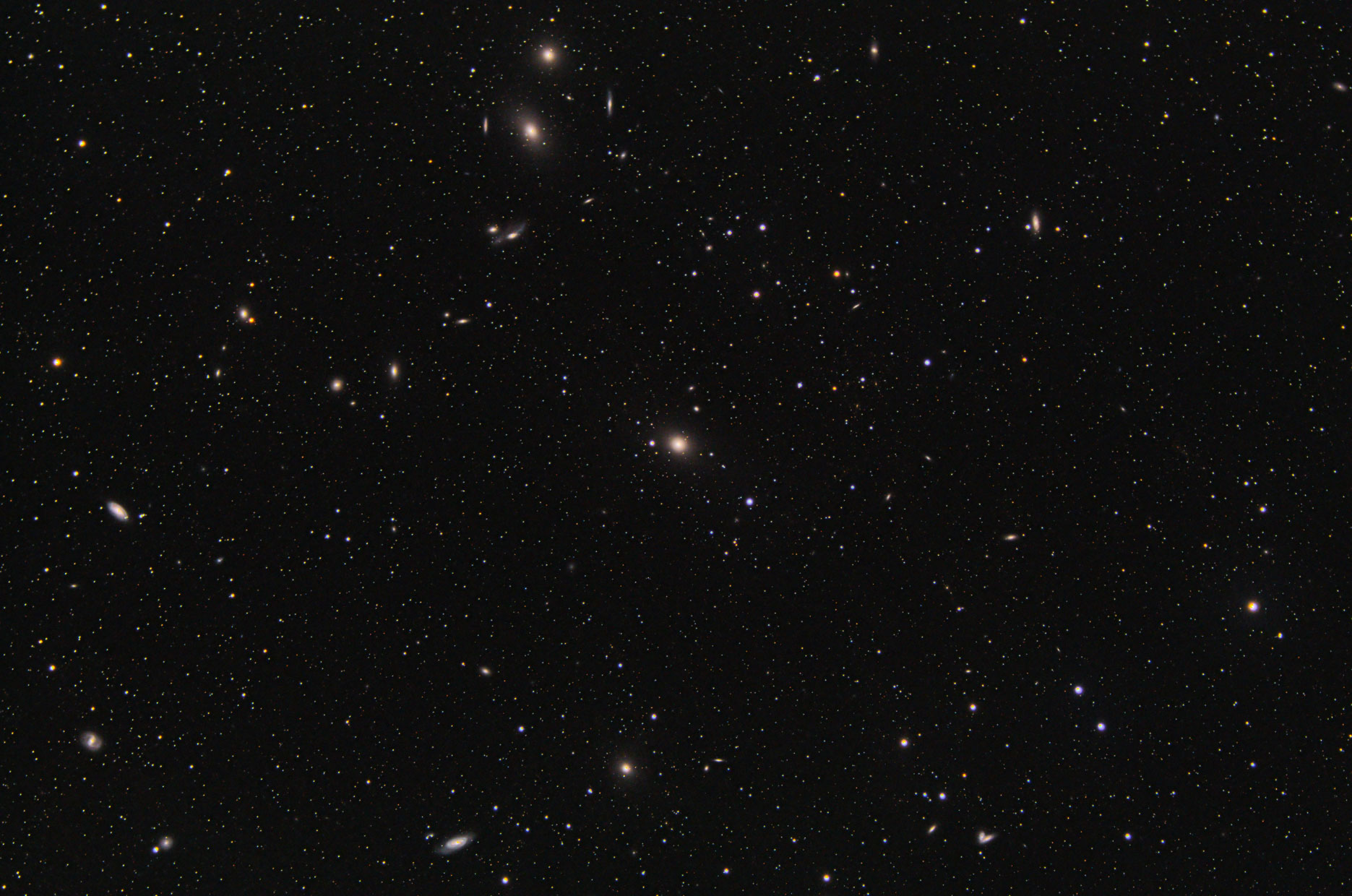 M87, in Bildmitte und ein Teil des Virgo Clusters mit der Markarian Chain. First light meines Grab'nGo Rigs, AM5 auf TC40. Teleskop EDPH 61 f 4.4. ASI 071MCPro; 30 x 180s,. Bearbeitung in PI und PS, zunehmend schlechter werdende Transparenz. N ist links, sorry ;-)