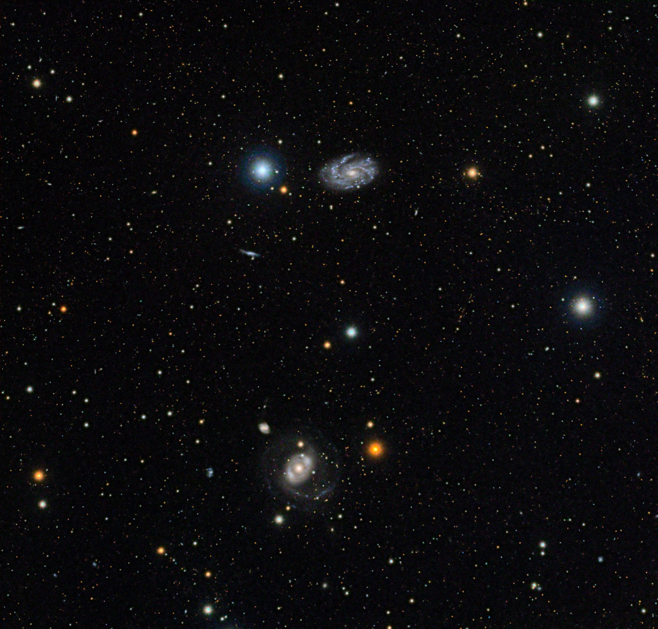 NGC 4151 (Saurons Auge) und NGC 4145 sind ein wunderschönes Galaxienpaar in Canes Venatici (Jagdhunde). In einer Entfernung von 62 Mio Lj. enthält NGC 4151 ein supermassives schwarzes Loch mit 37,6 Mio Sonnenmassen.
