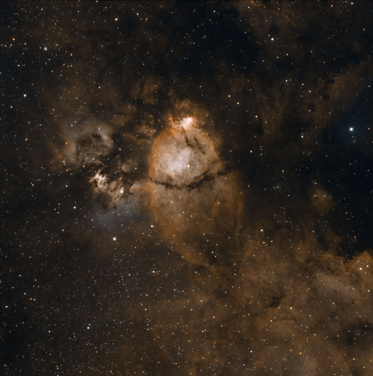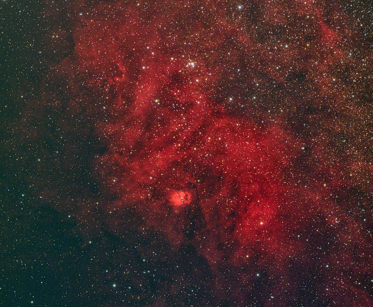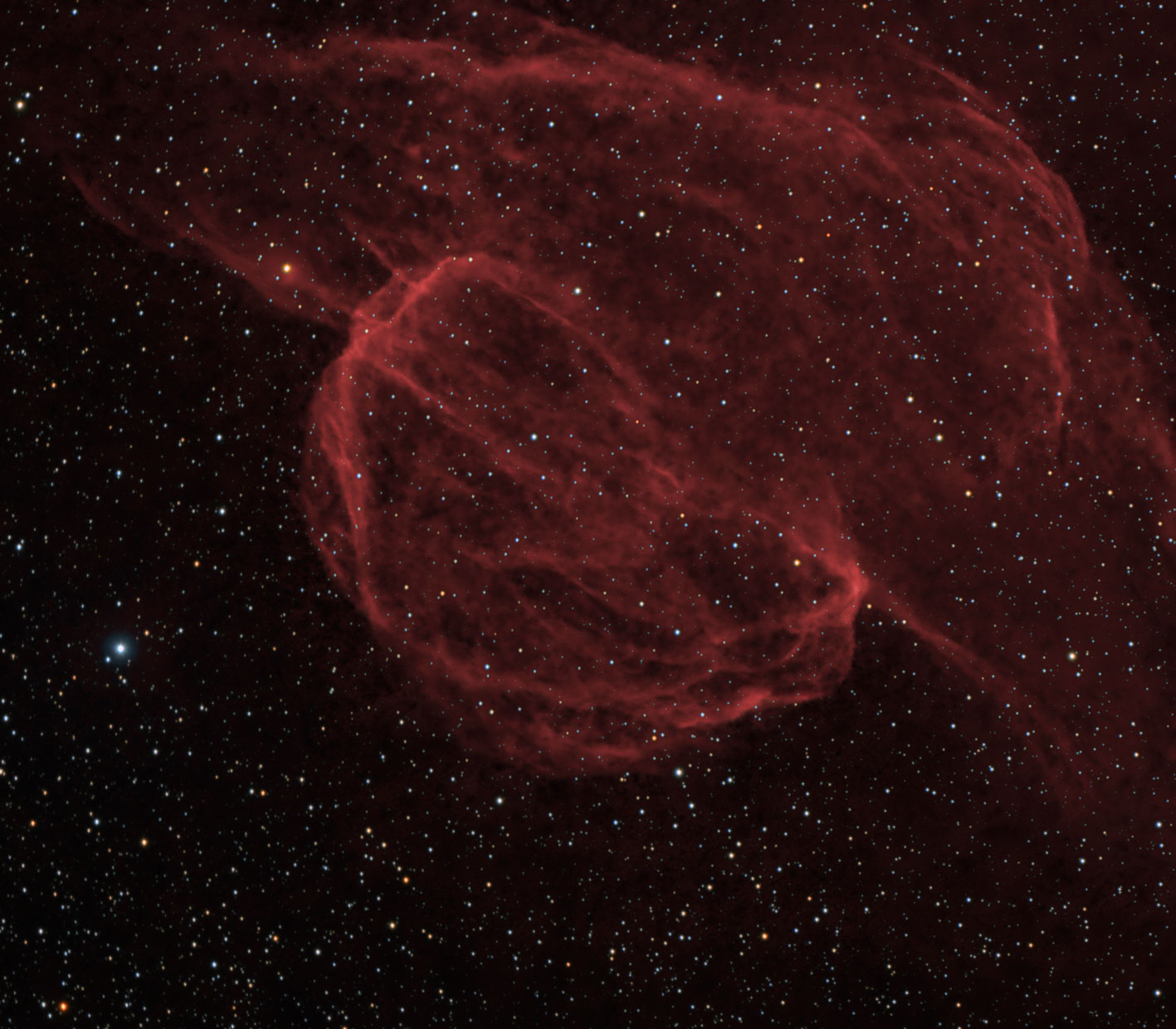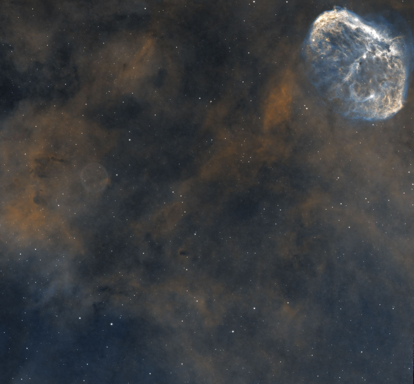 Die OIII Daten des vorhergehenden Bildes haben mich ermutigt eine Kombination mit einer älteren Halpha Aufnahme zu versuchen. Die Struktur der OIII Blase um NGC 6888 ist deutlich zu erkennen.