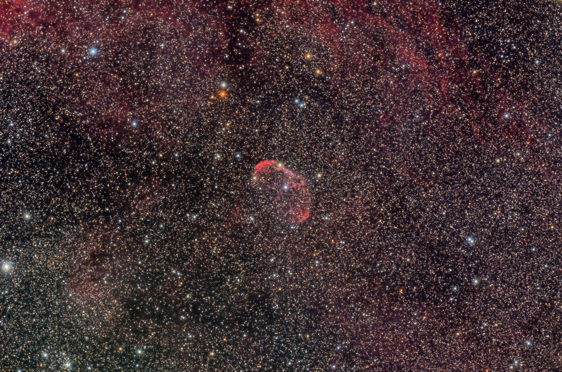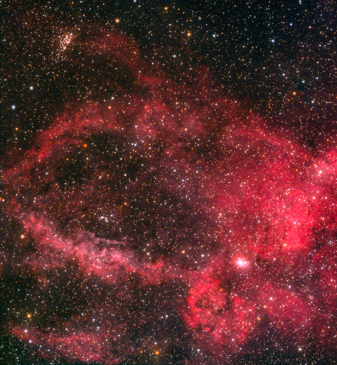 Sh2-91 ist im Gegensatz zum Zirrusnebel deutlich schwächer und wesentlich älter. Die Schwierigkeit bei seiner Fotografie ist, dass er in einem Meer aus Sternen ertrinkt. Aufnahmedaten: Teleskop Veloce RH200, ASI 533MM, Ha und OIII 20 x 5 min. HOO Palette ohne Sterne bearbeitet