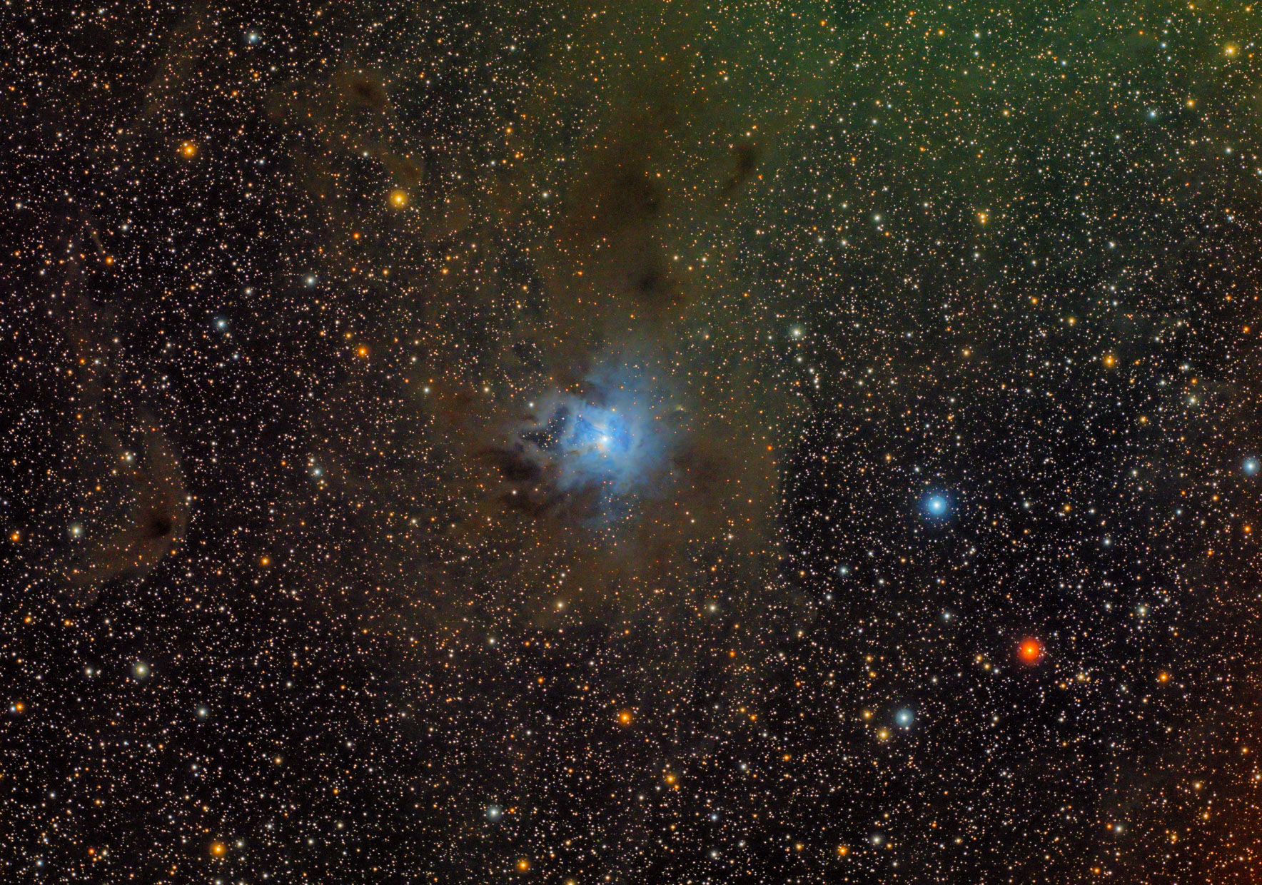 NGC 7023 oder Iris-Nebel ist ein heller Reflexionsnebel im Sternbild Kepheus. Umgeben von interstellarem Staub reflektiert er das Licht des Sterns SAO 19158. Aufnahmedaten: Teleskop Veloce 200 f3, Kamera ASI 071 MC Pro, 30 x 2 min., bearbeitet in PI.
