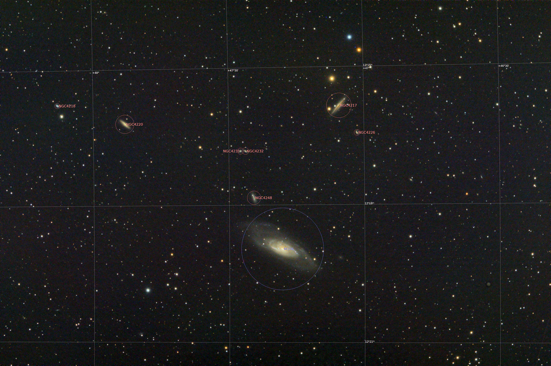 Messier 106 ist eine intermediäre Spiralgalaxie, d.h. von der Klassifikation SAB ist sie zwischen Balkenspirale und Spiralgalaxie angesiedelt. Ihre Entfernung beträgt etwa 24 MLj und in ihrem Kern befindet sich ein Blackhole mit etwa 4 Milliarden Sonnenmassen. NGC 4217 ist ein wahrscheinlicher Begeleiter. TMB 105/6.2, ASI 071 MC, 37 x 120 s, PI und LR