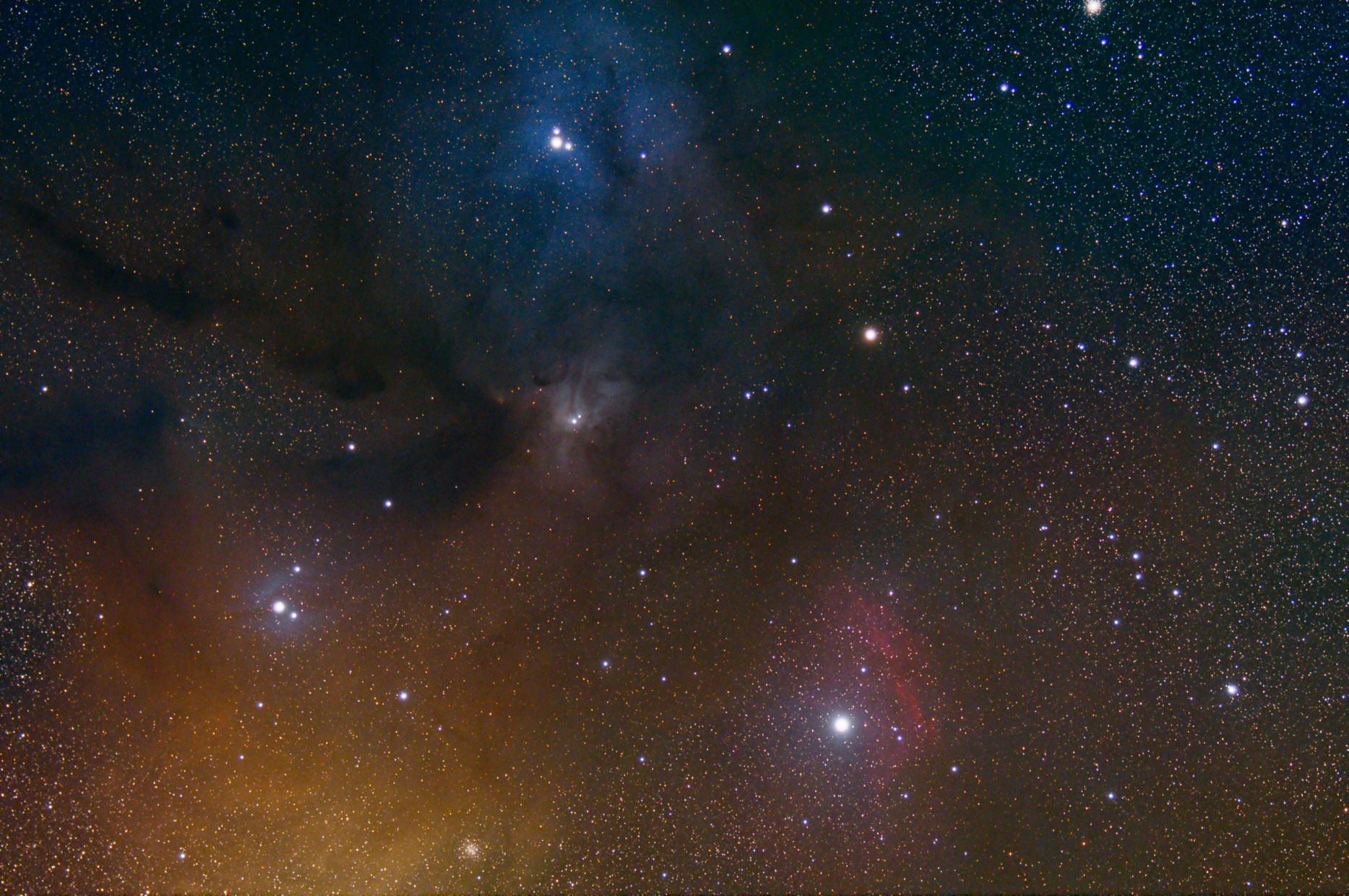 Die Rho Ophiuchi Molekular Wolke enthält neben Dunkelnebeln auch Emissions- und Reflexionsnebel. Näheres dazu bei https://en.wikipedia.org/wiki/Rho_Ophiuchi_cloud_complex EDPH II 61/4,5, ASI 071 MC, 30 x 120 s, Bearbeitung in PI