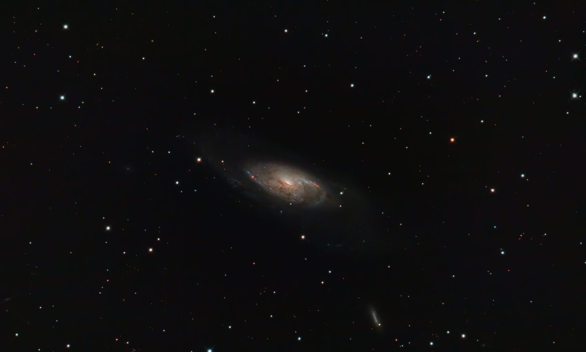 Messier 106 oder NGC 4258 ist eine Balkenspiral-Galaxie mit einem aktiven Nukleus vom Typ Seifert II. NGC 4217 oberhalb ist wohl ein Begleiter. Sie liegt im Sternbild Canes Venatici und ist ca. 27 Mio. Lj entfernt. RC 8, ASI 071 MC, 50 x 300 sec. 27. und 28.5., CLS-CCD, PI, PS u. LR CC.
