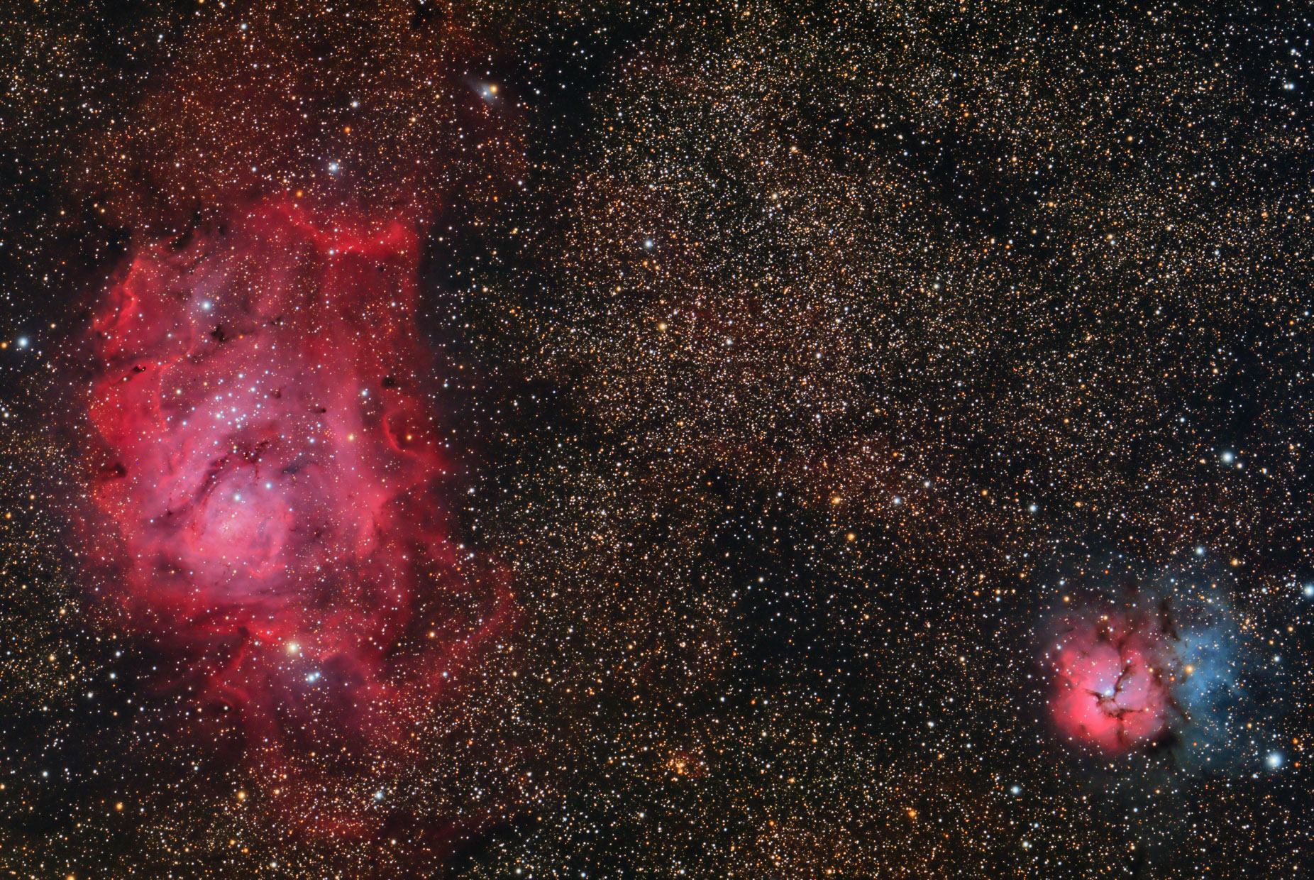 M8 und M20, Lagunen- und Trifid-Nebel im Sagittarius, der erstere eine HII Region und reiner Emissionsnebel, der zweite ein Emissions- und Reflexionsnebel. TMB 105/6,2, ASI 071, 20 x 300 sec., PI, PS und LR CC. 23. und 24.7., Monsaraz im Alentejo, neu bearbeitet 2023