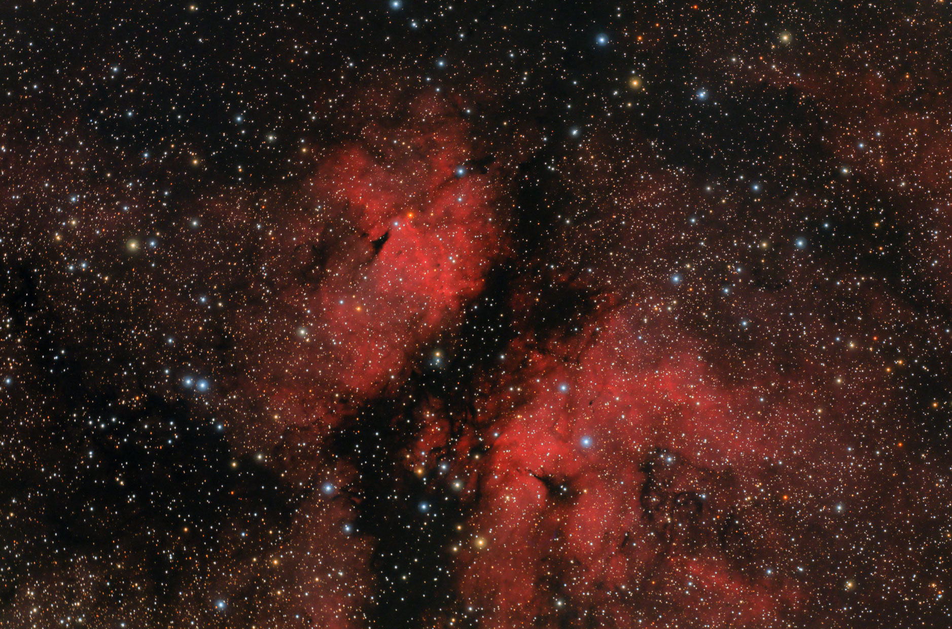 IC 1318B und C, zwei der hellen Nebel um Gamma Cygni (Sadr), Emissionsnebel und H-II Gebiete, getrennt durch die Dunkelwolke LDN 889 . Sie werden auch als Schmetterlingsnebel bezeichnet.