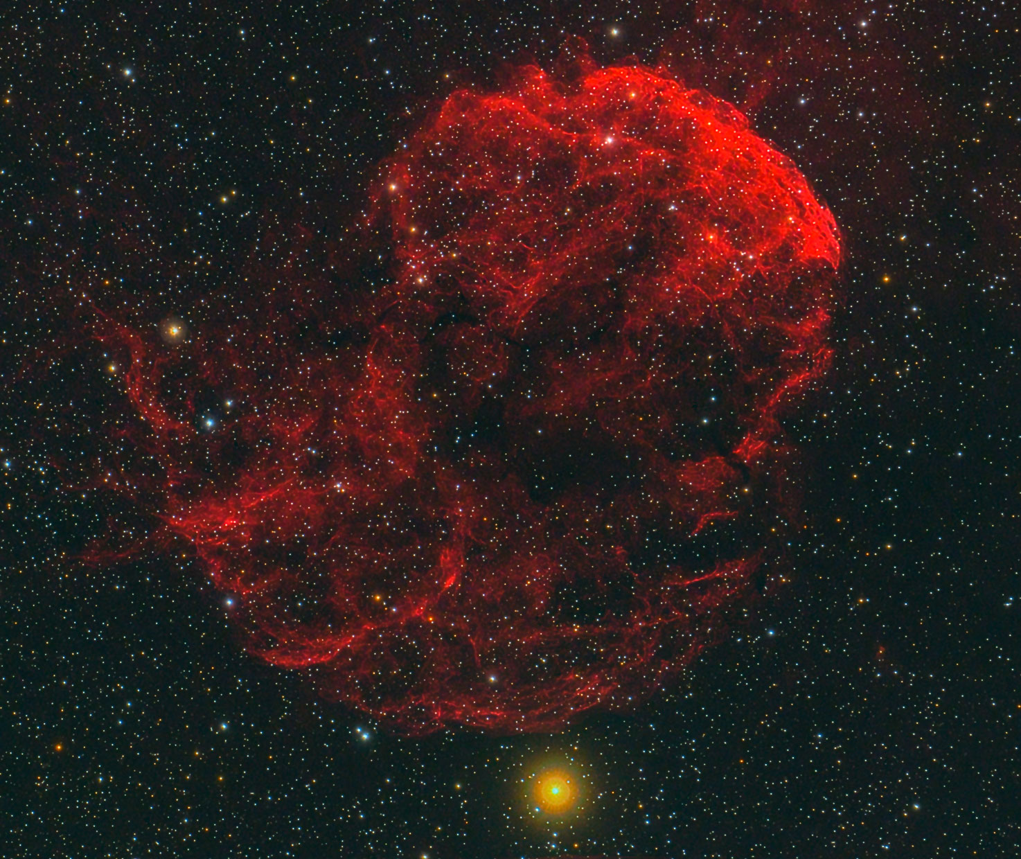Sh2-91 ist Teil eines großen SNR mit der Bezeichnung G 65.3+5.7. Seine Filamente sind wesentlich zarter als die des Zirrhusnebels. Er liegt 2° nördlich von Albireo. Die SN ist wohl vor 440.000 Jahren in 2500 Lj Entfernung explodiert. Am oberen Bildrand Cambell's Wasserstoff Stern, ein planetarer Nebel im Frühstadium. Veloce RH200, ASI 071, 40 x 3 min., PI, PS + LR CC.