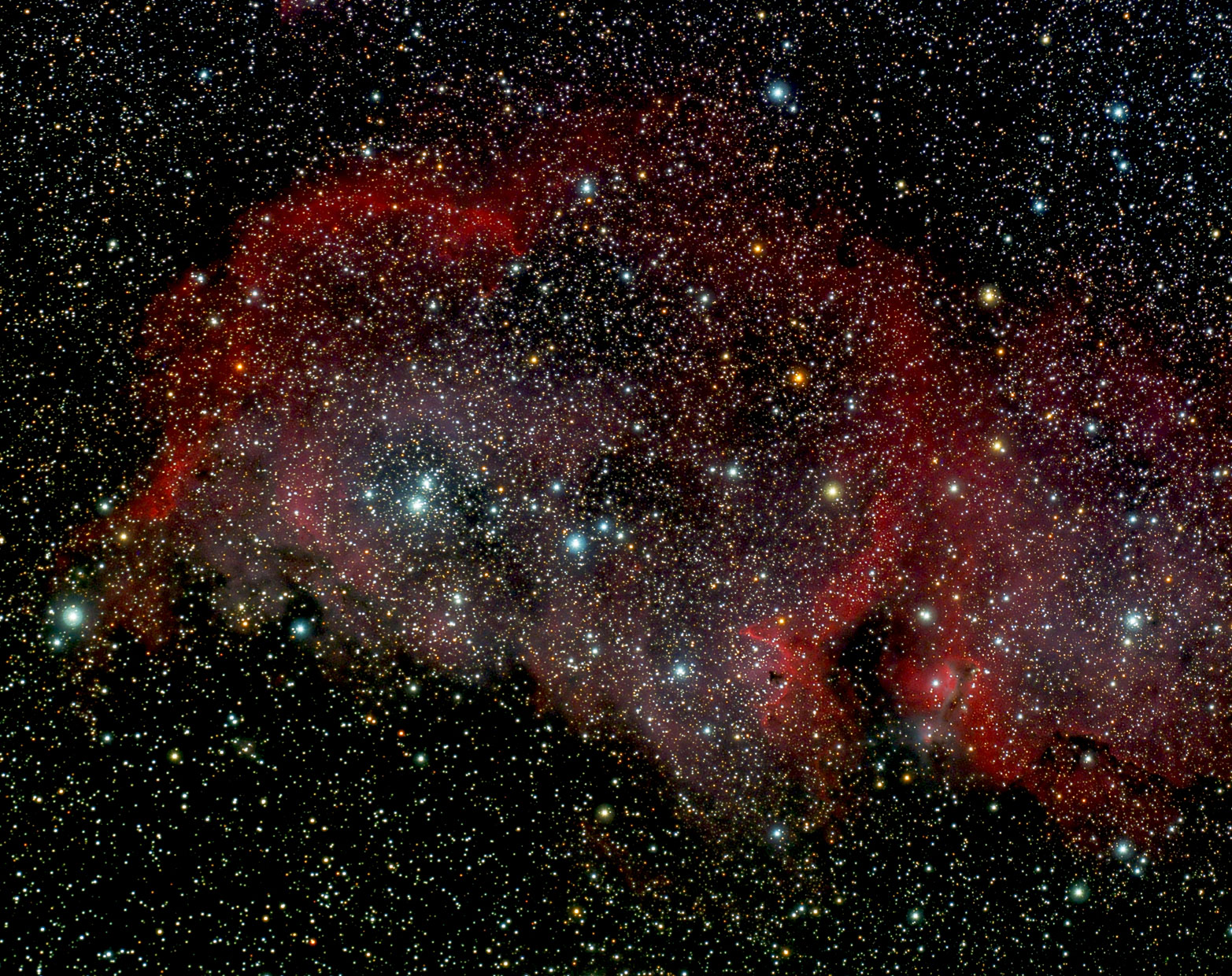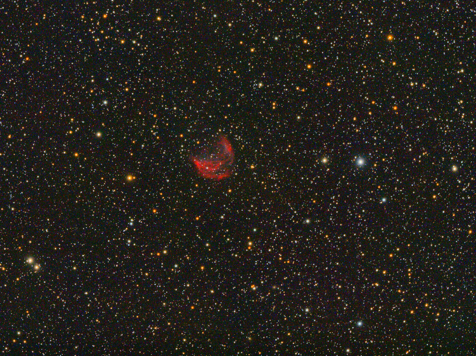 IC 2177, seagull nebula, ist eine Nebelregion zwischen Monoceros und Canis major. Entdeckt wurde er vom Amateuer Astronom Isaac Roberts. Der Name Möwennebel bezeichnet eigentlich die gesamte Nachbarregion mit den offenen Sternhaufen NGC 2335 und NGC 2343. Veloce RH 200, ASI 071, 40 x 180 s, PI + LR CC neu bearbeitet 2023