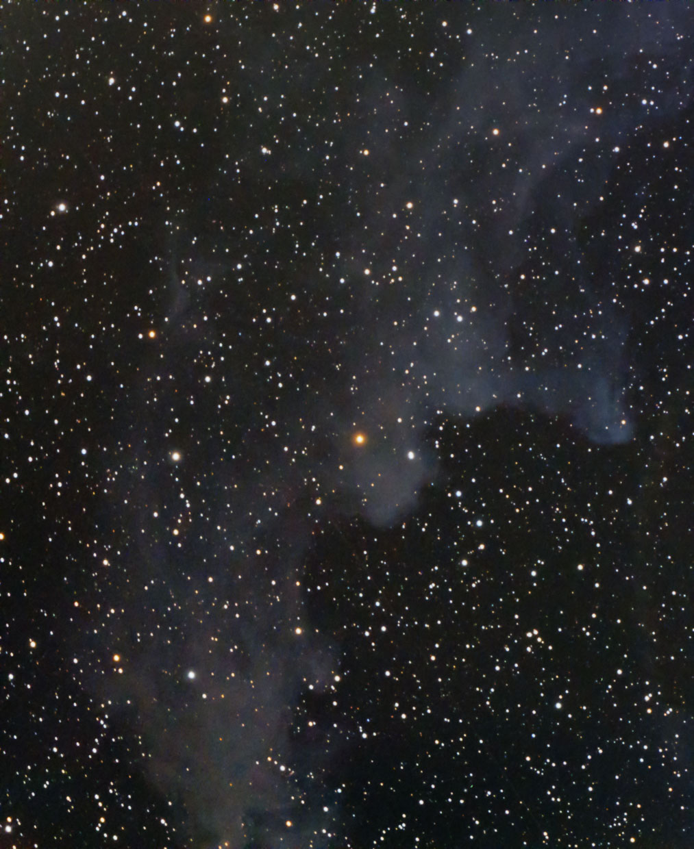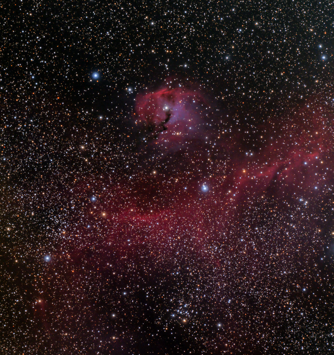 B 142 + 143, Barnards E - Dunkelwolken im Adler, firstlight der noch nicht modifizierten Canon 6D, TMB 105/6,2, TSFLAT2,5, 12x5 min. ISO 800, Integration mit IP, Bearbeitung IP + LR CC 7/2019