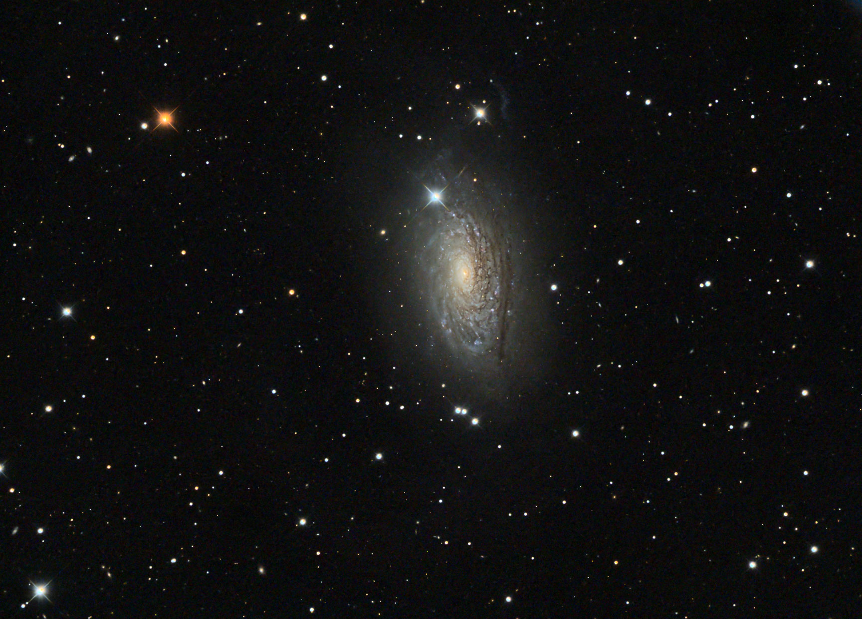 M63, die Sonnenblumengalaxie, ihre knotigen Strukturen markieren die zahlreichen Sternentstehungsgebiete. Sie ist Teil der M51 Gruppe, liegt im Sternbild Canes venatici und ist ca. 29,3 Mio. Ly entfernt. RC 8, ASI 071, 15 x 300 s 1.6., 30 x 300 s 2.6., PI, LR CC. Mässige Transparenz.