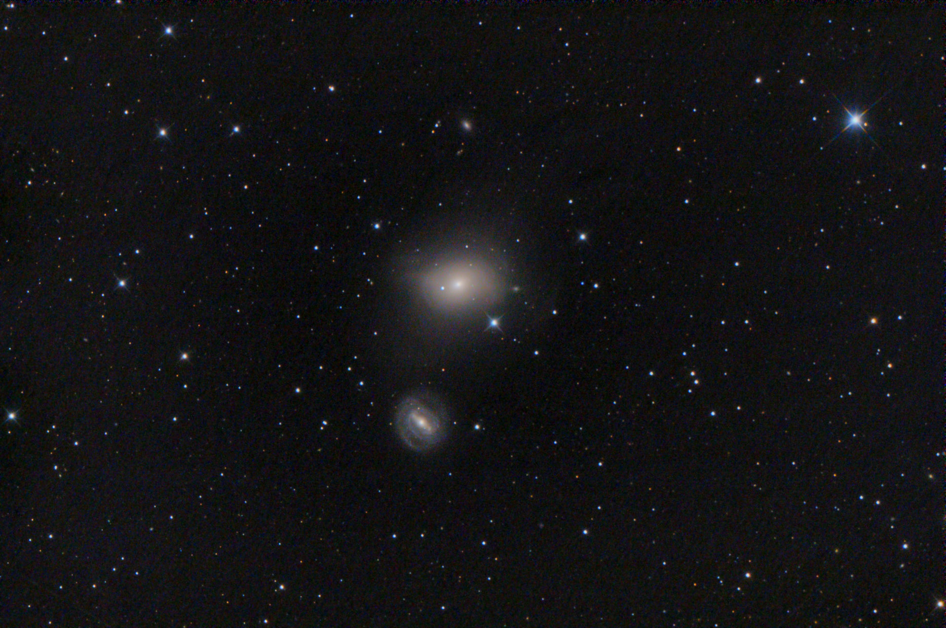 M85 und NGC 3494, zwei Galaxien im Coma Berenices. M85 ist eine elliptische Galaxie, die vermutlich vor ca. 4 - 7 Milliarden Jahren mit einer anderen Galaxie verschmolz. Sie interagiert mit ihrer Nachbarin NGC 3494. RC 8, ASI 071, 20 x 300 s, PI, PS + LR CC.