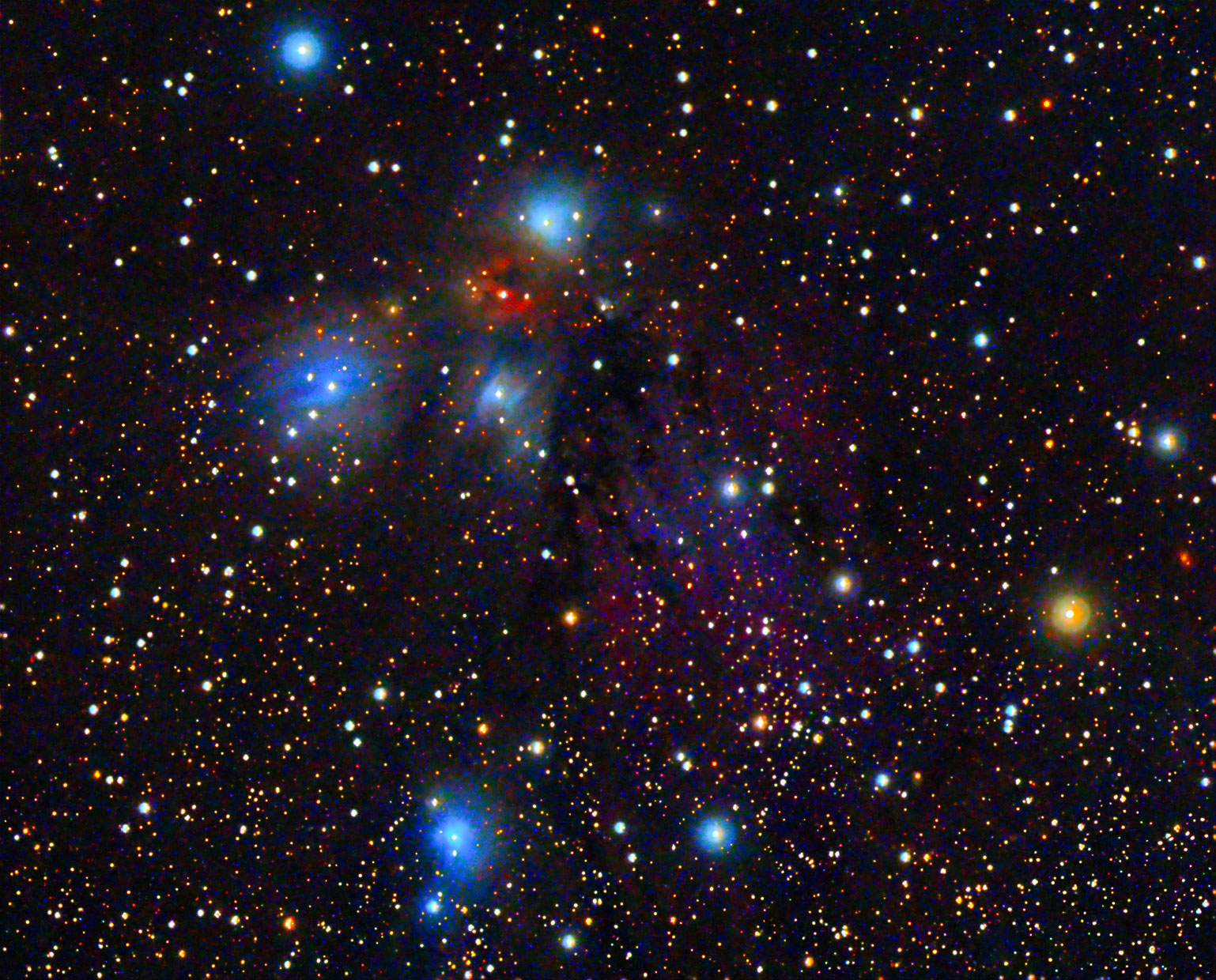 Reflexionsnebel in Monoceros. NGC 2170 in Bildmitte darunter VdB 69 , links davon VdB 68 NGC 2182 unten in Bildmitte; alle zusammen der "Angel Nebula". Veloce RH 200, 40 x 180 s, PI, PS + LR CC. Mäßige Transparenz durch zunehmende Schleierwolken..