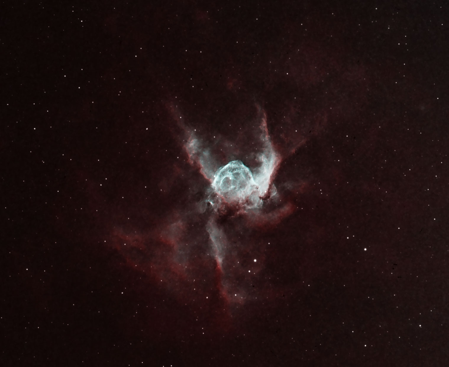 NGC 2359, Entennebel oder Thors Helm ist ein Wolf-Rayet-Ringnebel im Sternbild Canis major. Veloce RH 200, STF8300m, 15 x 300s Halpha und 15 x 300s O III. HOO-Palette, PI und LR CC. Mondalter 11,6 Tage
