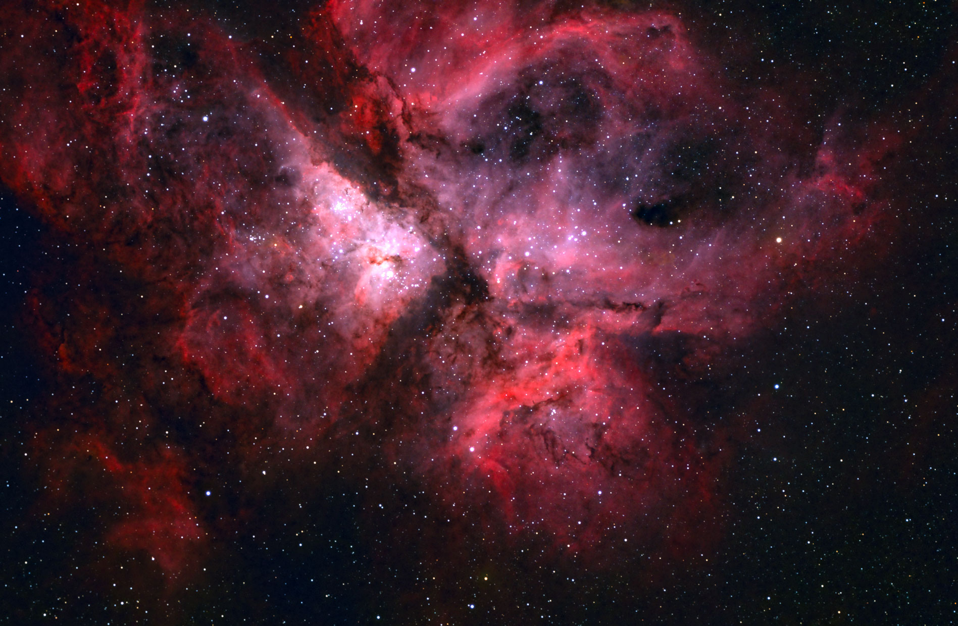 NGC 3372 ist der helle Nebelkomplex um den Stern Eta carinae, heller und größer als der Orionnebel. TS100Q, AZEQ6GT, ASI 071, 10 x 300 s, PI, PS + LR CC. Leider beendete EQmod immer wieder willkürlich die Nachführung, deshalb nur 10 lights. Aufnahmeort: Rooisand Desert Lodge, Namibia.