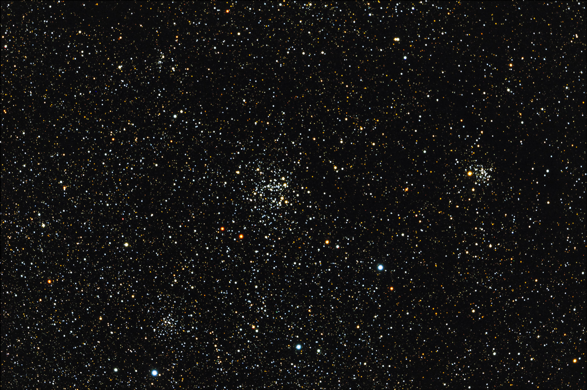 NGC 663, ein offener Sternhaufen in der Cassiopeia. Seine Nachbarn sind NGC 659 unten und NGC 654 rechts. TMB 105/6.2, ASI 071 20 x 120 s, IP, PI, PS + LR CC. Mondalter 12 Tage.
