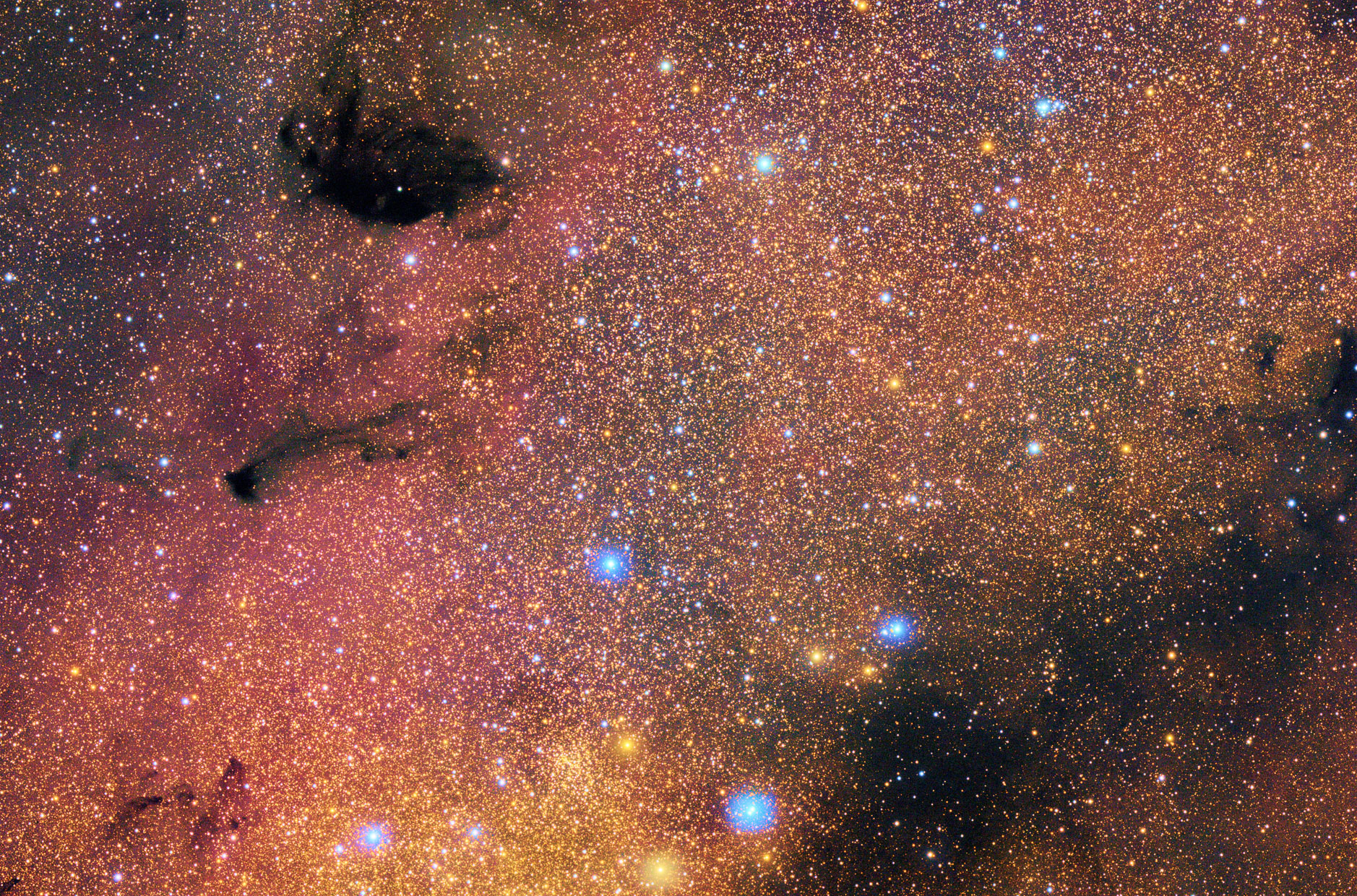 Messier 24, die kleine Sagittarius Wolke im Schützen. Ein tunnelartiges Fenster erlaubt hier einen Blick auf das galaktische Zentrum. Unten mittig NGC 6303. Teleskop Esprit 120 f/7, ASI 071 MCpro, 20 x 120 s, PI und PS neu bearbeitet 22.3.26