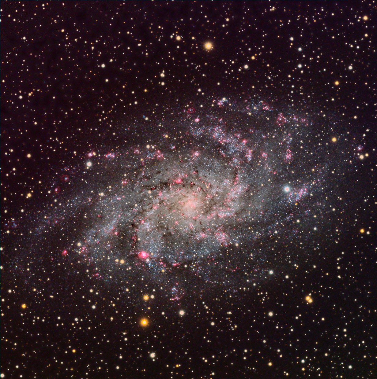 M 33, die Dreiecks Galaxie ist die kleinste Spiralgalaxie in der Lokalen Gruppe und ca. 2,73 Millionen Lichtjahre von der Milchstraße entfernt. Sie wurde wahrscheinlich schon vom italienischen Astronom G. B. Hodierna 1654 entdeckt und beschrieben. Aufnahmedaten: Veloce RH200, ASI 533 MM, 30 x 120 s L, jeweils 10 x 120 s R, G und B und 10 x 300 s Halpha. Bearbeitung mit PI und PS