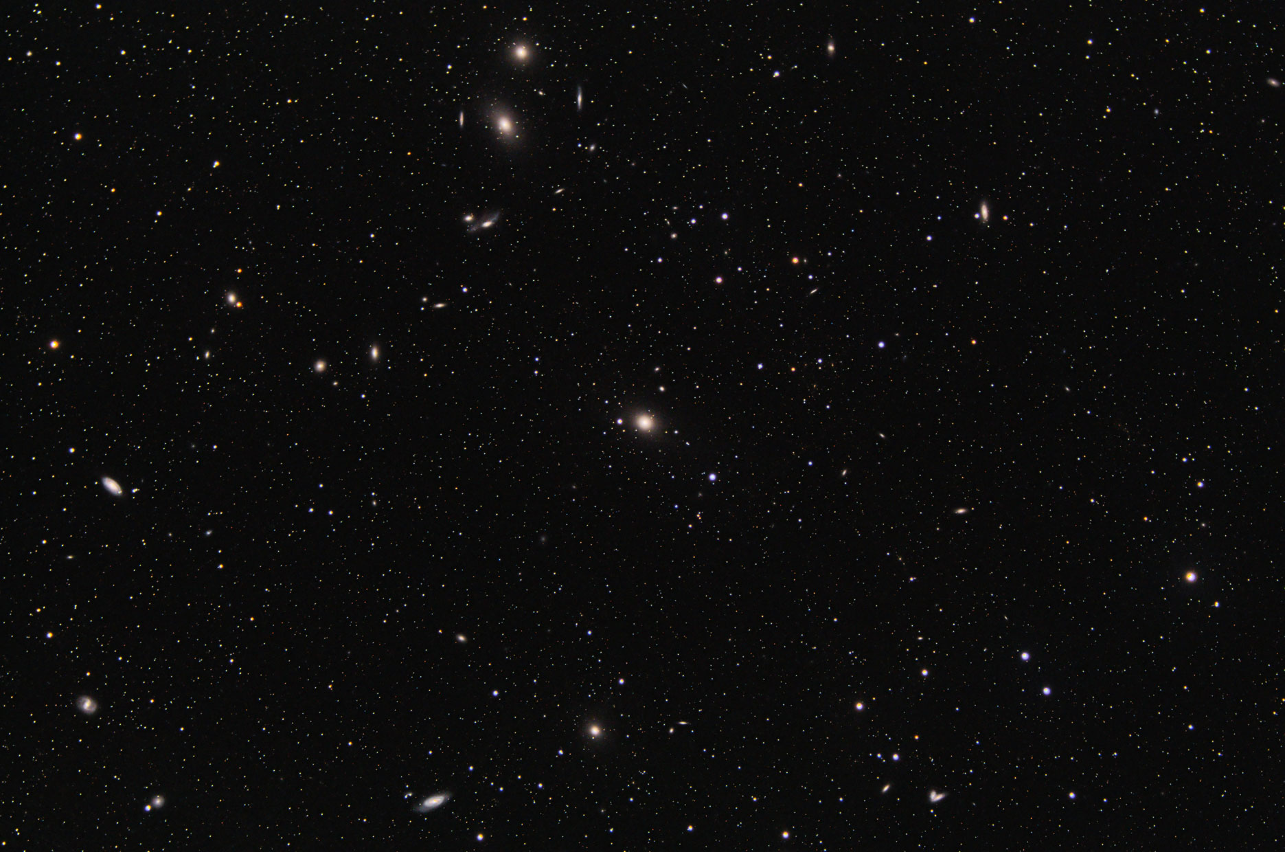M87, in Bildmitte und ein Teil des Virgo Clusters mit der Markarian Chain. First light meines Grab'nGo Rigs, AM5 auf TC40. Teleskop EDPH 61 f 4.4. ASI 071MCPro; 30 x 180s,. Bearbeitung in PI und PS, zunehmend schlechter werdende Transparenz. N ist links, sorry ;-)