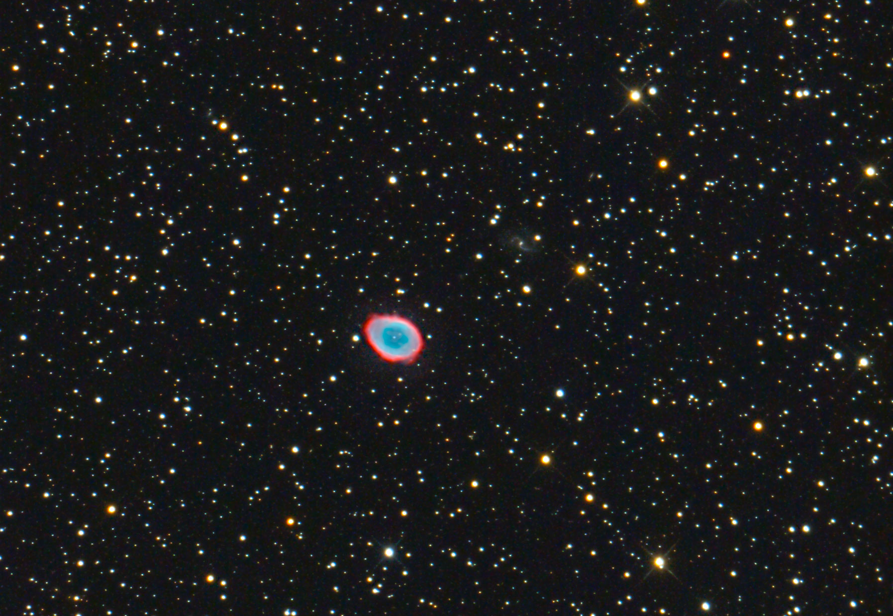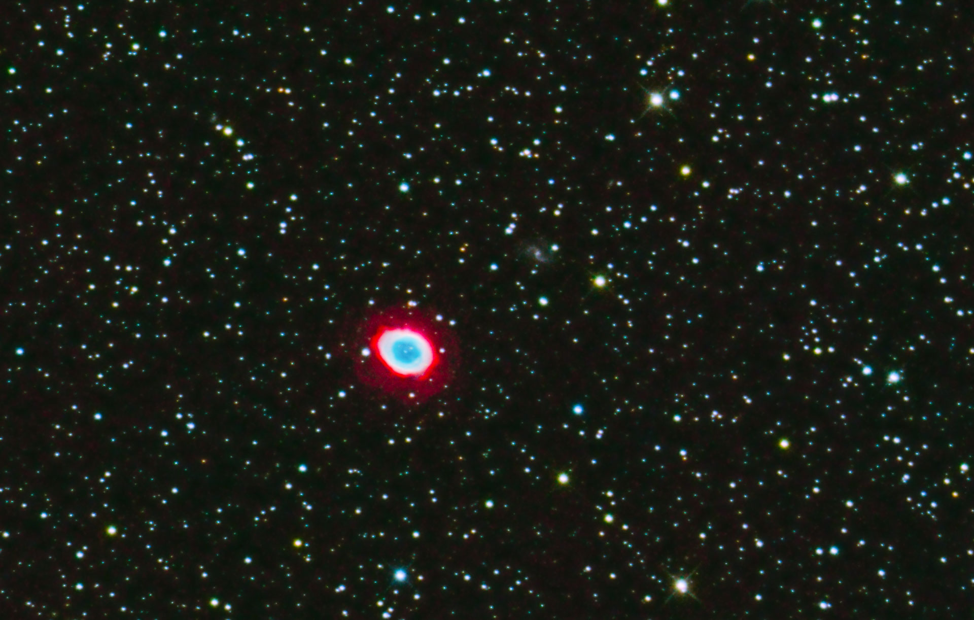 Messier 57, der Ringnebel, planetarischer Nebel im Sternbild Lyra. Der kleine Punkt im Innern des Nebels ist der Weiße Zwerg der vom ursprünglichen Stern übrig blieb. Rechts oberhalb kann man die Galaxie IC 1296 erkennen. RC8, ASI 071, 38 von 50 Aufnahmen a 180 s. PI, PS + LR CC