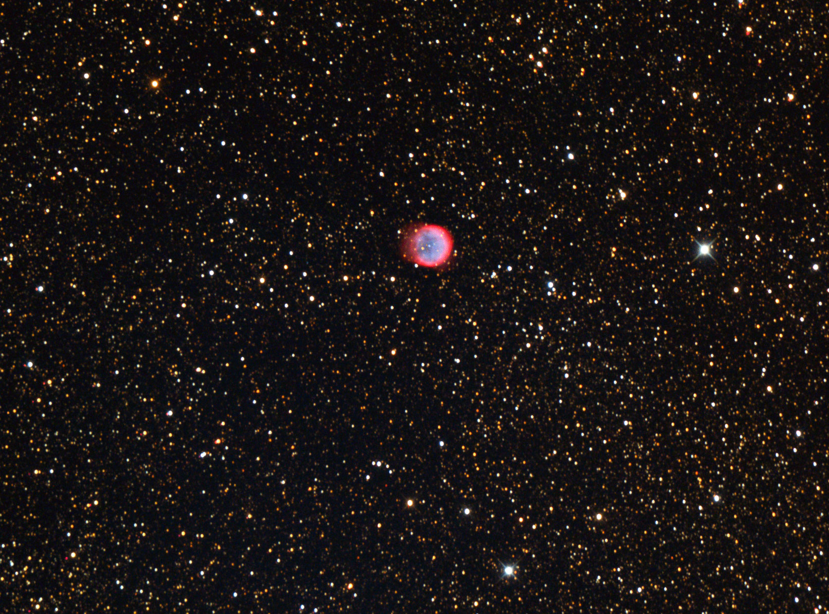 M76 - Little Dumbbell oder Kleiner Hantelnebel ist ein planetarischer Nebel im Perseus. Seine Entfernung beträgt ca. 21 Lichtjahre. RC8 Canon 6Da, 36 x 180 s, 1800 ISO, IP, PS + LR CC. Hohe Zirren haben die leichte Unschärfe verursacht.