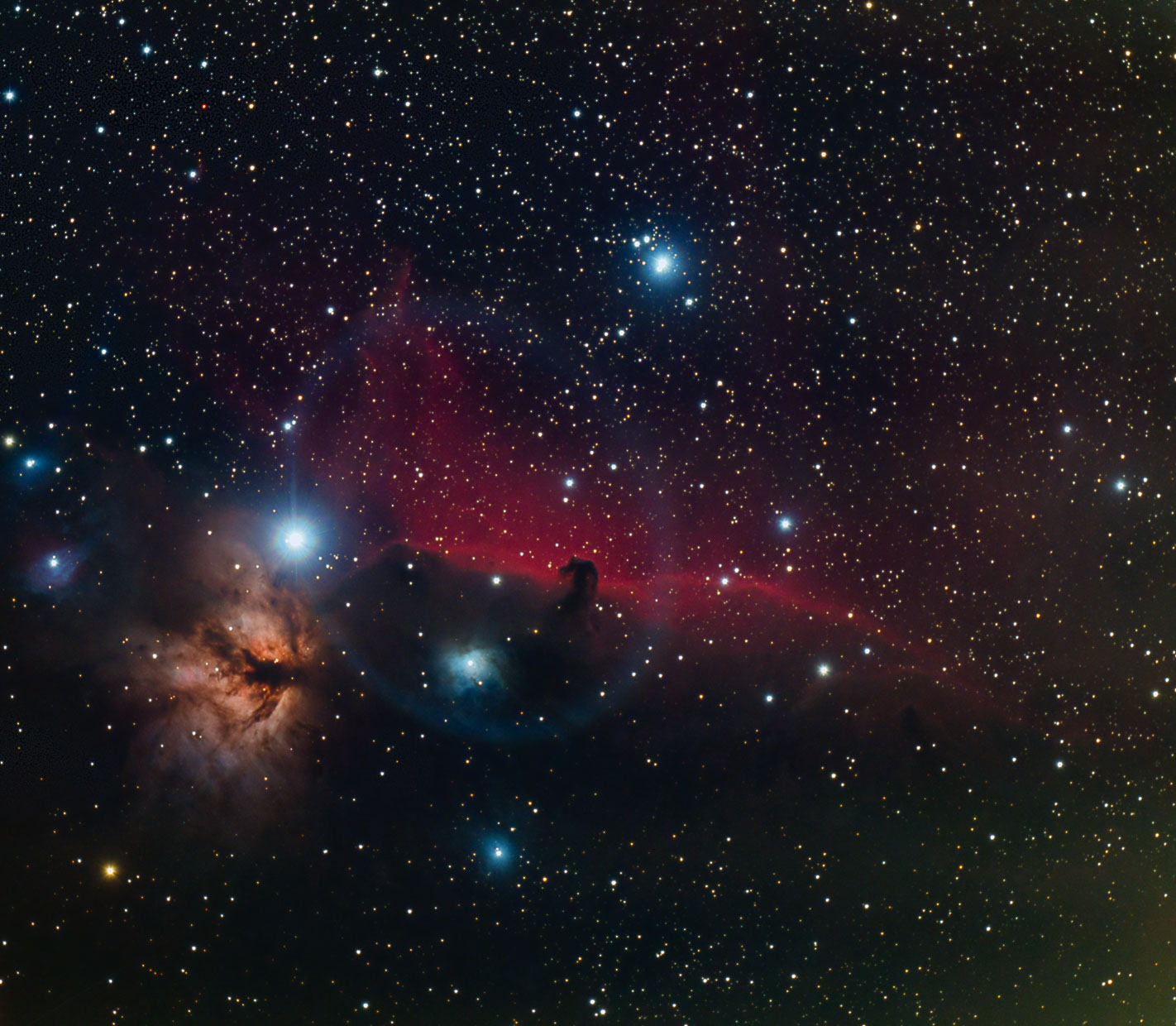 NGC 2024, B33 und NGC 2023 - Pferdeköpfchen und Flammennebel, 30 Aufnahmen a 120 sec., ISO 800, Canon 6Da, Veloce RH200.