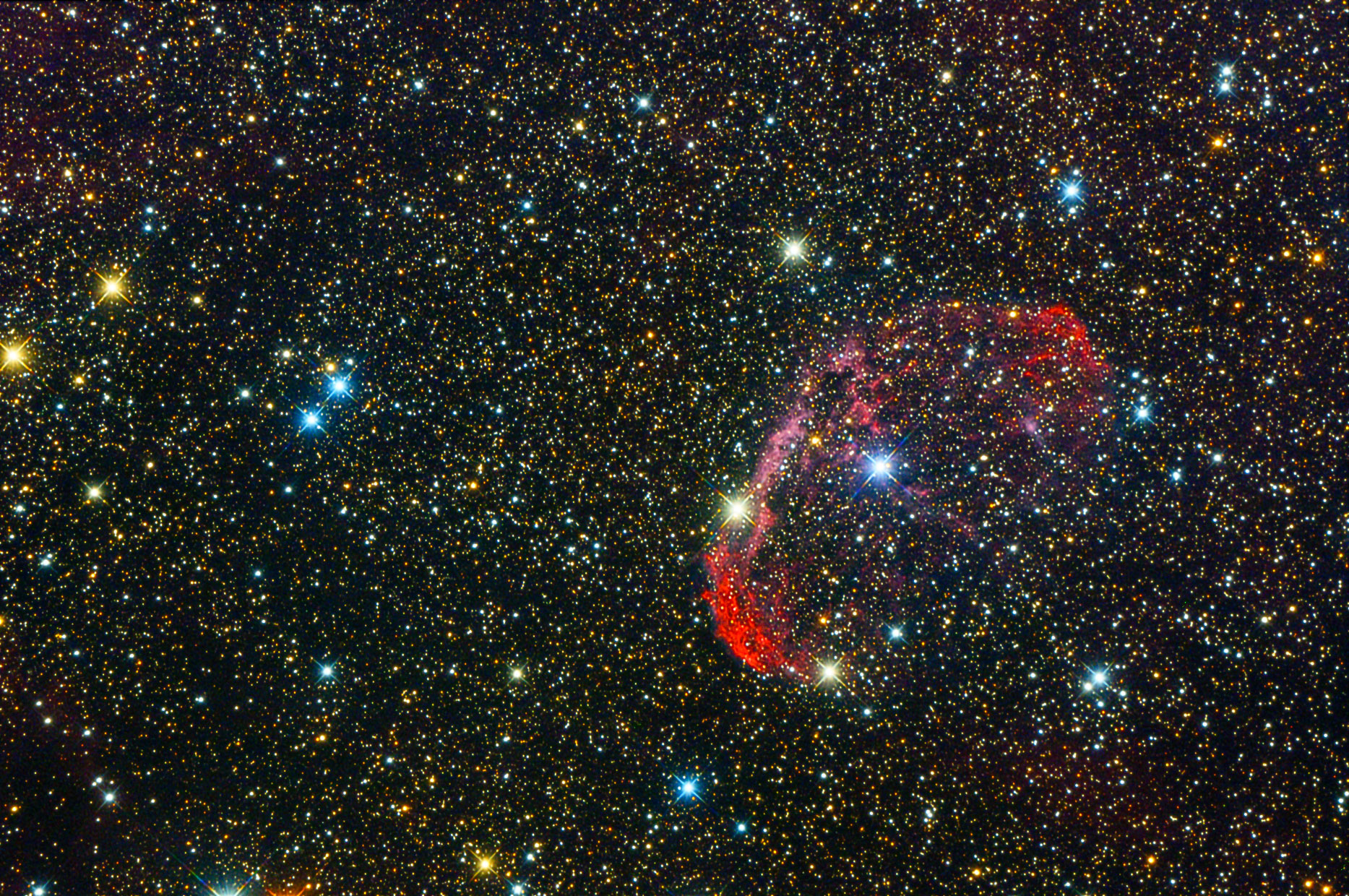 NGC 6888, auch Mondsichelnebel oder Crescent Nebula, wird von Winden des Wolf-Rayet-Stern in seinem Zentrum geformt. Entfernung ca. 5000 Lj. im Sternbild Cygnus. RC8, ASI 071, 24 x 180 s, Bearbeitung PI, PS + LR CC.