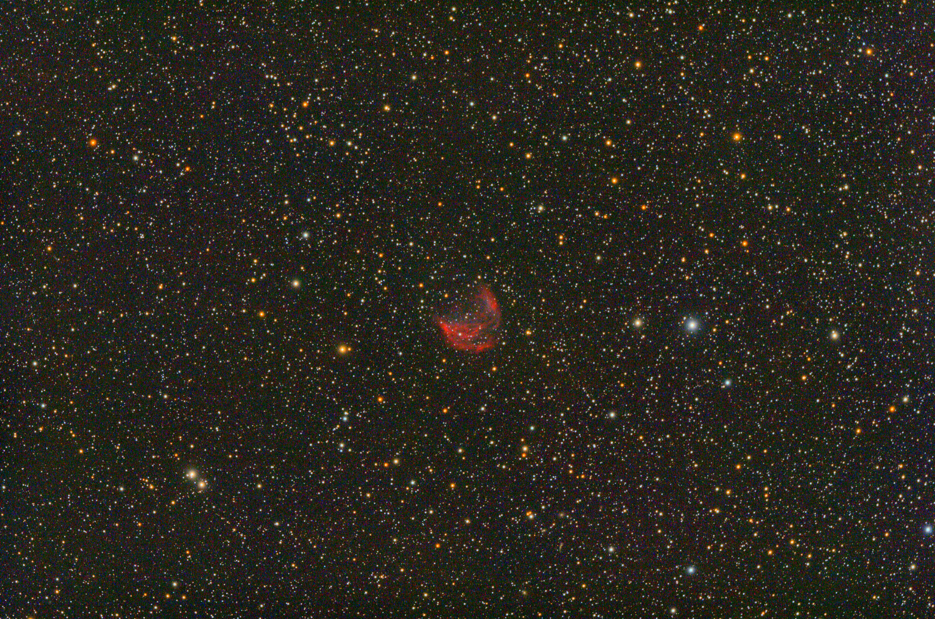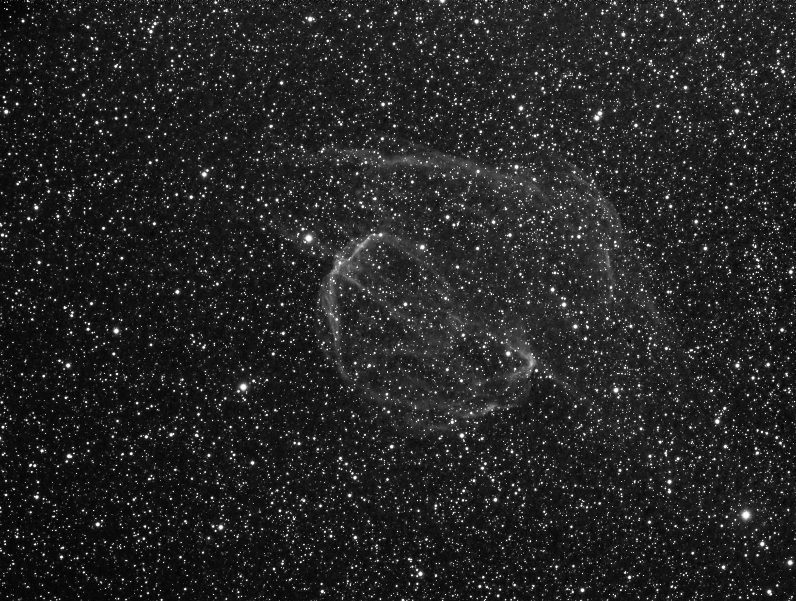 SH2-224 ein Supernova Rest im Sternbild Auriga. Das sonderbar geformte Objekt ist sehr lichtschwach und leuchtet am hellsten in Halpha. 3 h 20 min. sind noch zu wenig Belichtungszeit.