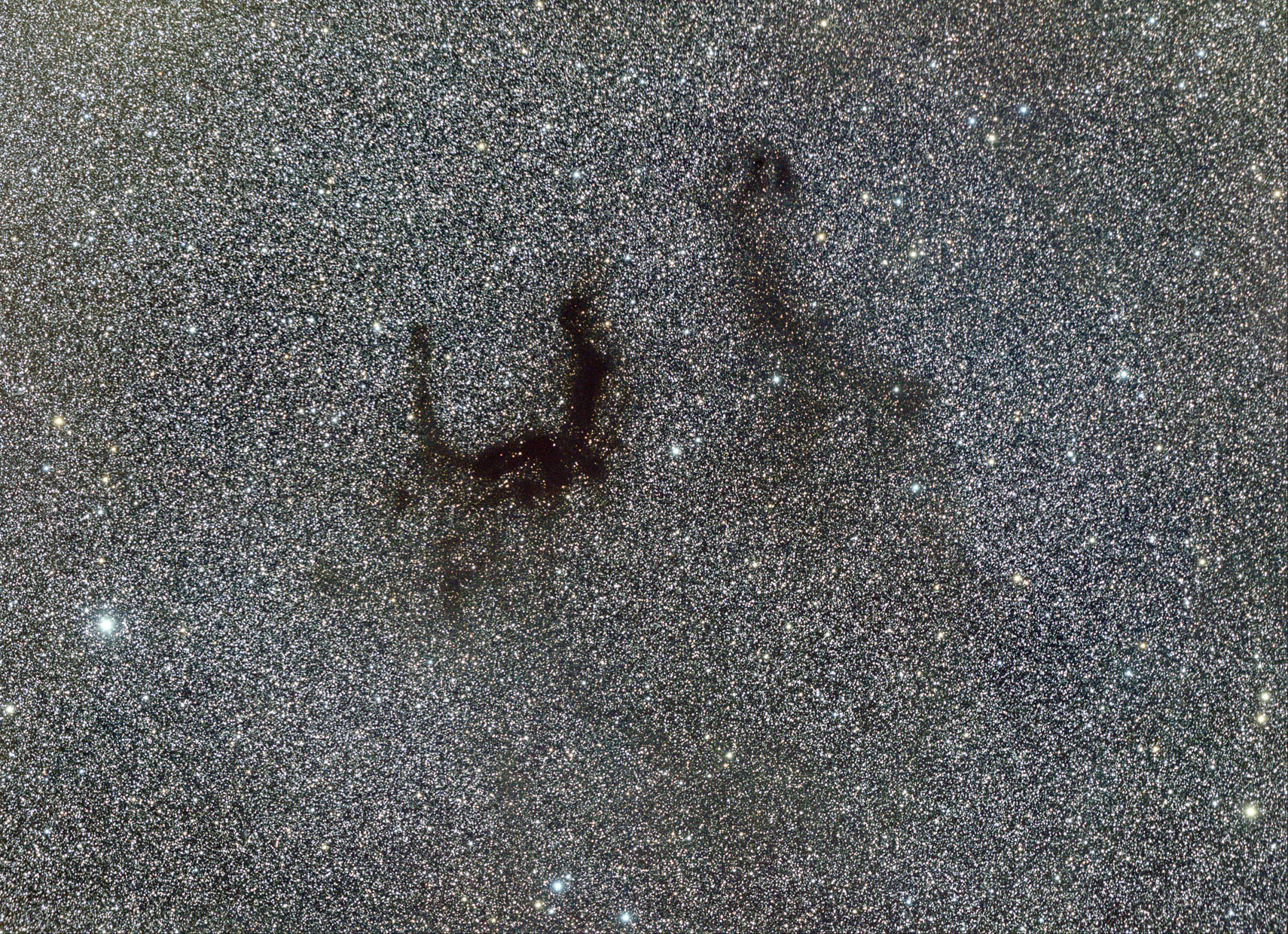 IC 1318B und C, zwei der hellen Nebel um Gamma Cygni (Sadr), Emissionsnebel und H-II Gebiete, getrennt durch die Dunkelwolke LDN 889 . Sie werden auch als Schmetterlingsnebel bezeichnet.