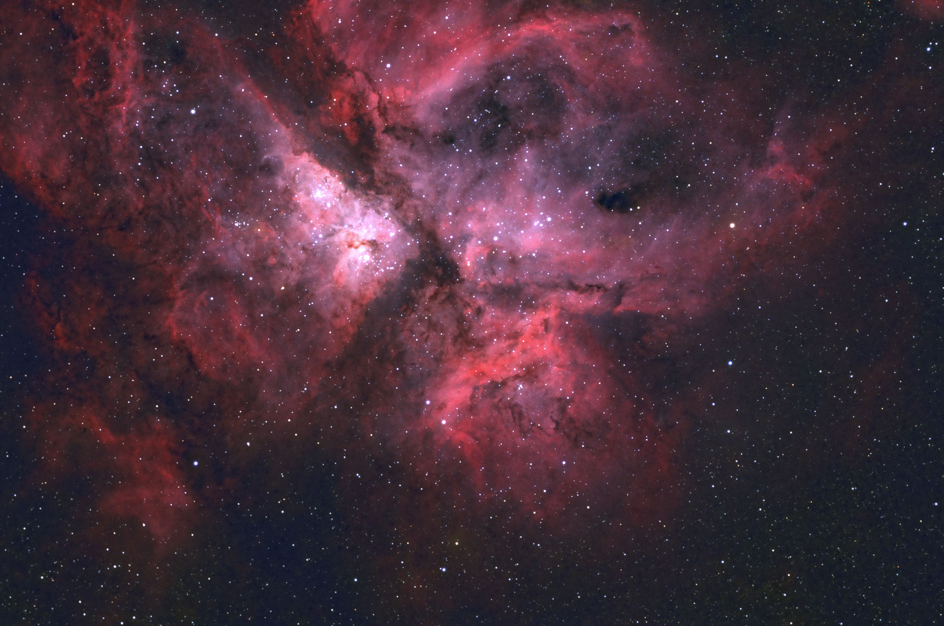 NGC 3372 ist der helle Nebelkomplex um den Stern Eta carinae, heller und größer als der Orionnebel. TS100Q, AZEQ6GT, ASI 071, 10 x 300 s, PI, PS + LR CC. Leider beendete EQmod immer wieder willkürlich die Nachführung, deshalb nur 10 lights. Aufnahmeort: Rooisand Desert Lodge, Namibia.