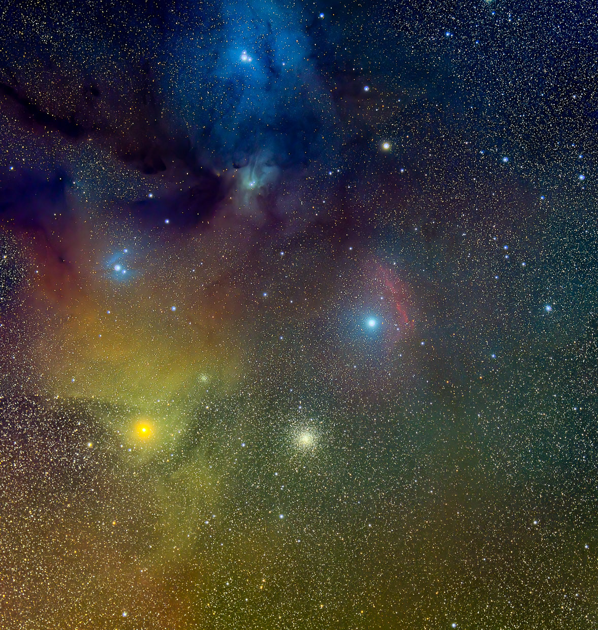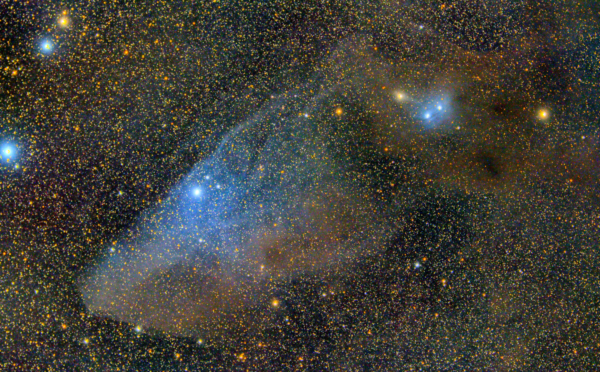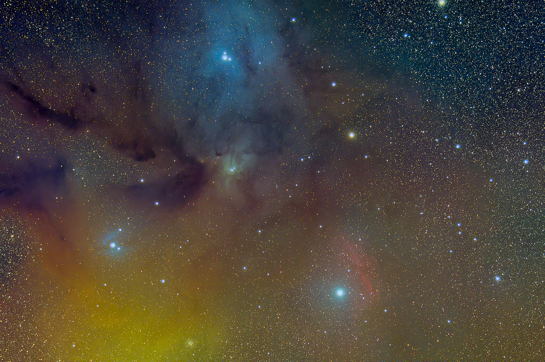 Die Rho Ophiuchi Molekular Wolke enthält neben Dunkelnebeln auch Emissions- und Reflexionsnebel. Näheres dazu bei https://en.wikipedia.org/wiki/Rho_Ophiuchi_cloud_complex EDPH II 61/4,5, ASI 071 MC, 30 x 120 s, Bearbeitung in PI und PS