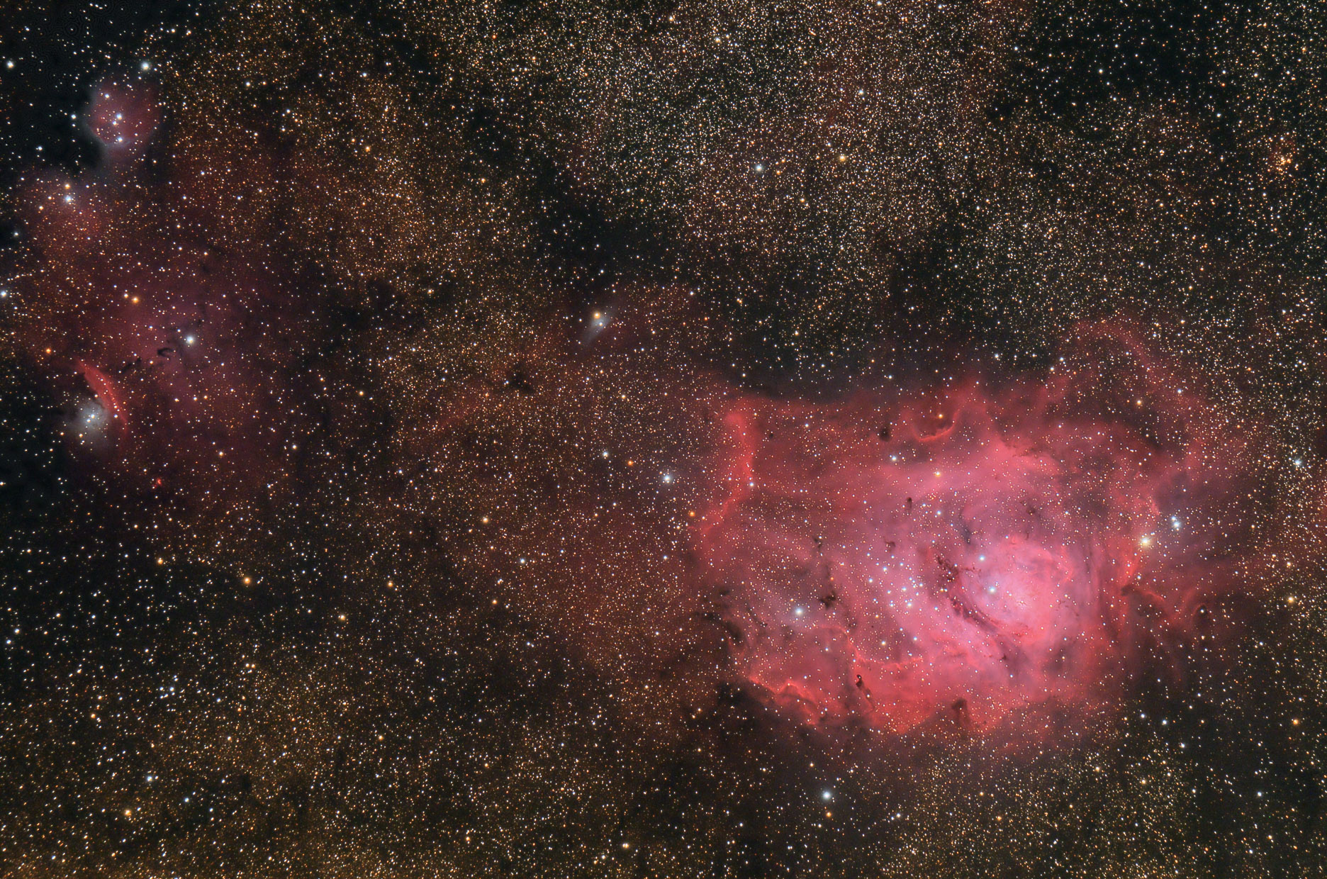 M 8, der Lagunennebel ist ein Sternentstehungsgebiet mit umgebender HII-Region in der Nähe des Milchstraßenzentrums. TMB 105/6,2, ASI 071 MC, 30 x 120s, PI + PS, neu bearbeitet 2023