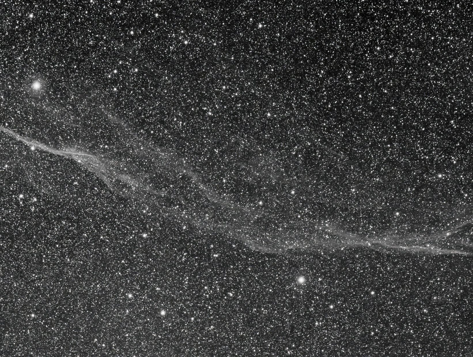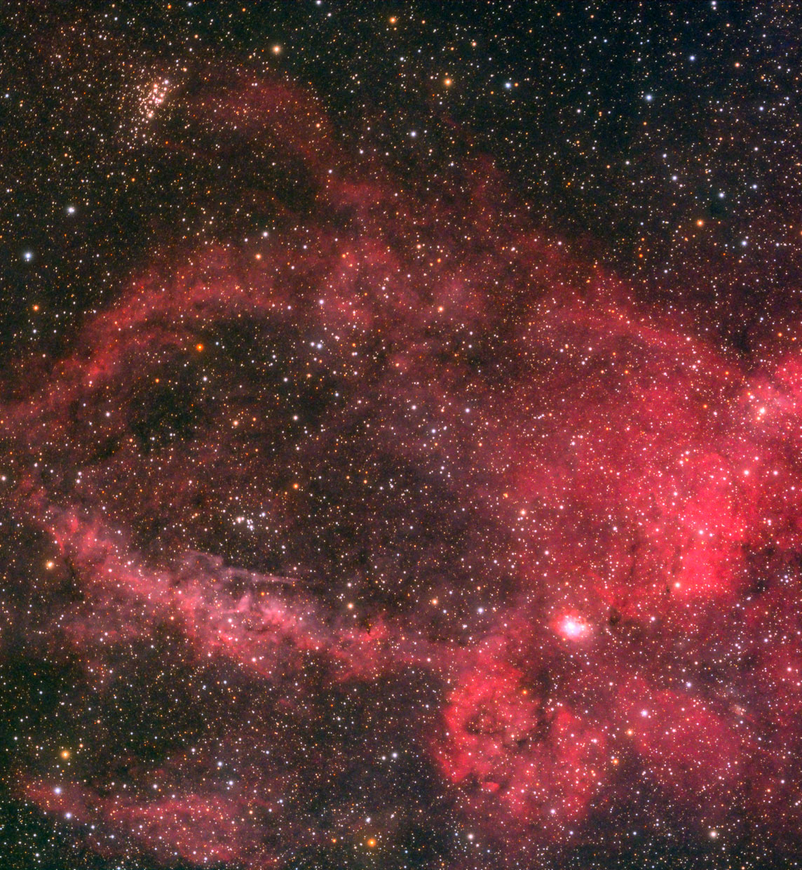 Neben dem Zirrhus Nebel im Sternbild Cygnus ist Sh2-91 ein weiterer Supernova Rest. Dicht bei Albireo lokalisiert, besteht er aus zarten, diffusen und filamentären Strukturen. Aufnahmedaten: Veloce RH200, STF-8300M, Ha Filter 3,5 nm, 20 x 5 min., Bearbeitung in PI und PS, Mondalter 13 Tage, Norden ist oben.