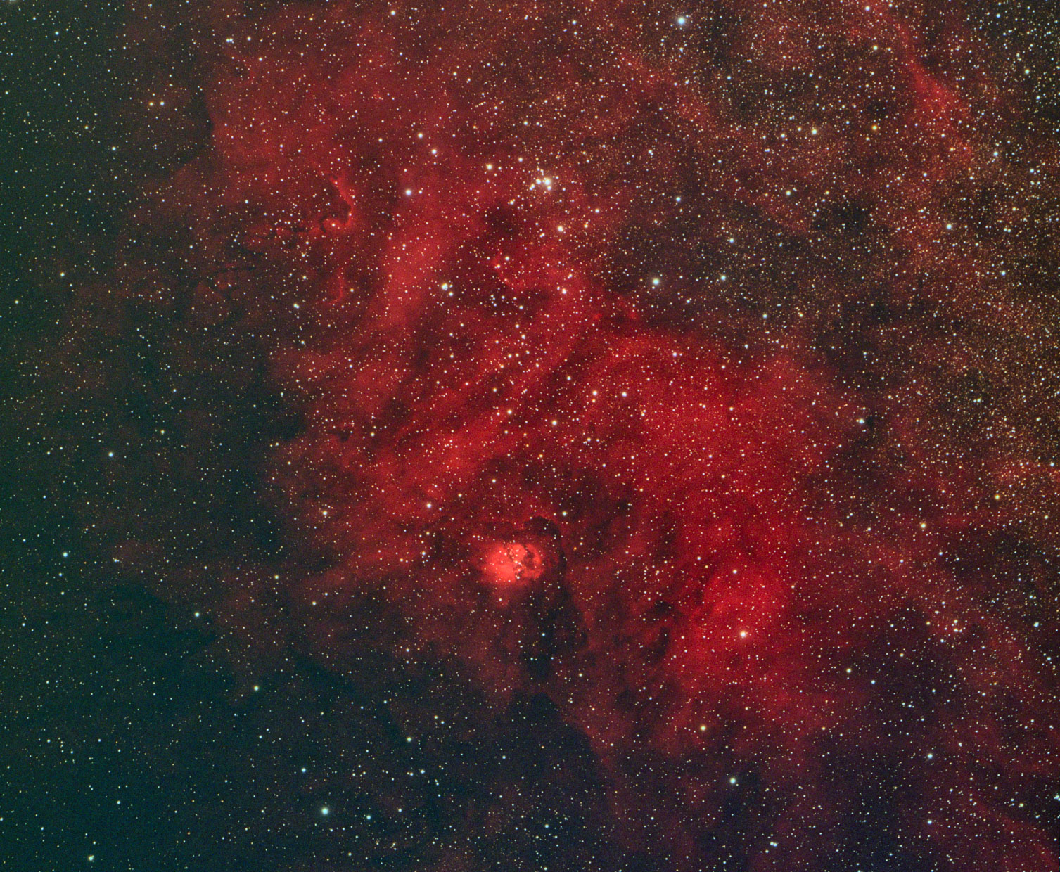 Unweit der Messier Ikonen, Adler- und Omeganebel im Sternbild Serpens Cauda und Teil der gleichen H II- Wolke liegt ein eher unscheinbares Schätzchen mit der Bezeichnung Sh2-54 aus dem Sharpless 2 Katalog. Auch Serpent's Nebula genannt, sollte man ihn nicht mit dem gleichnamigen Nebel aus dem Computerspiel "Mass Effect: Destination Zero" verwechseln. Im Bild ist er der helle Fleck unterhalb der Bildmitte, oberhalb und links davon liegt der Offene Sternhaufen NGC 6604. Aufnahmedaten: Veloce RH200, STF 8300 M, Ha 3,5 nm, 30 x 5 min., Bearbeitung in PI und PS Mondalter 12,3 Tage