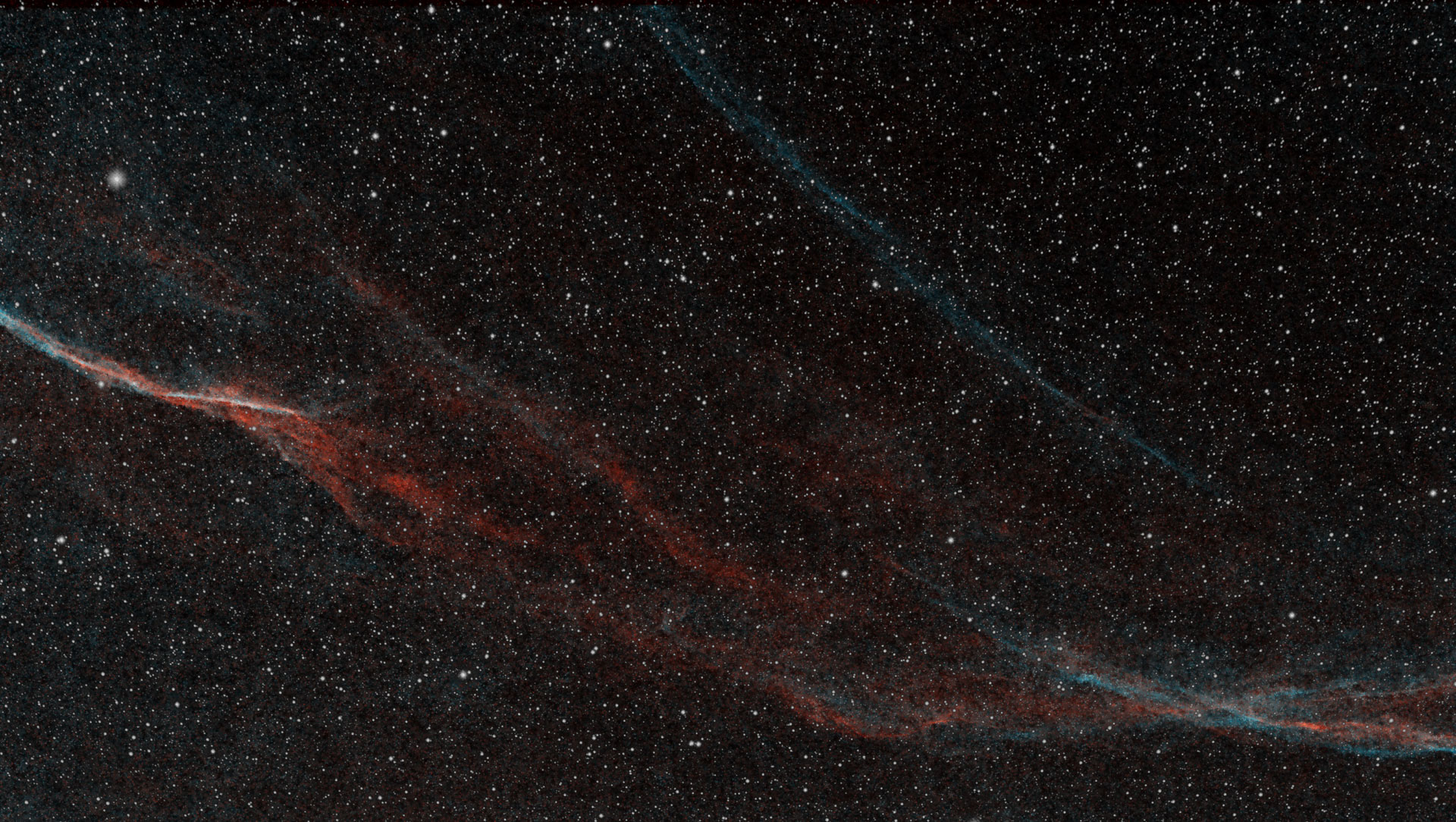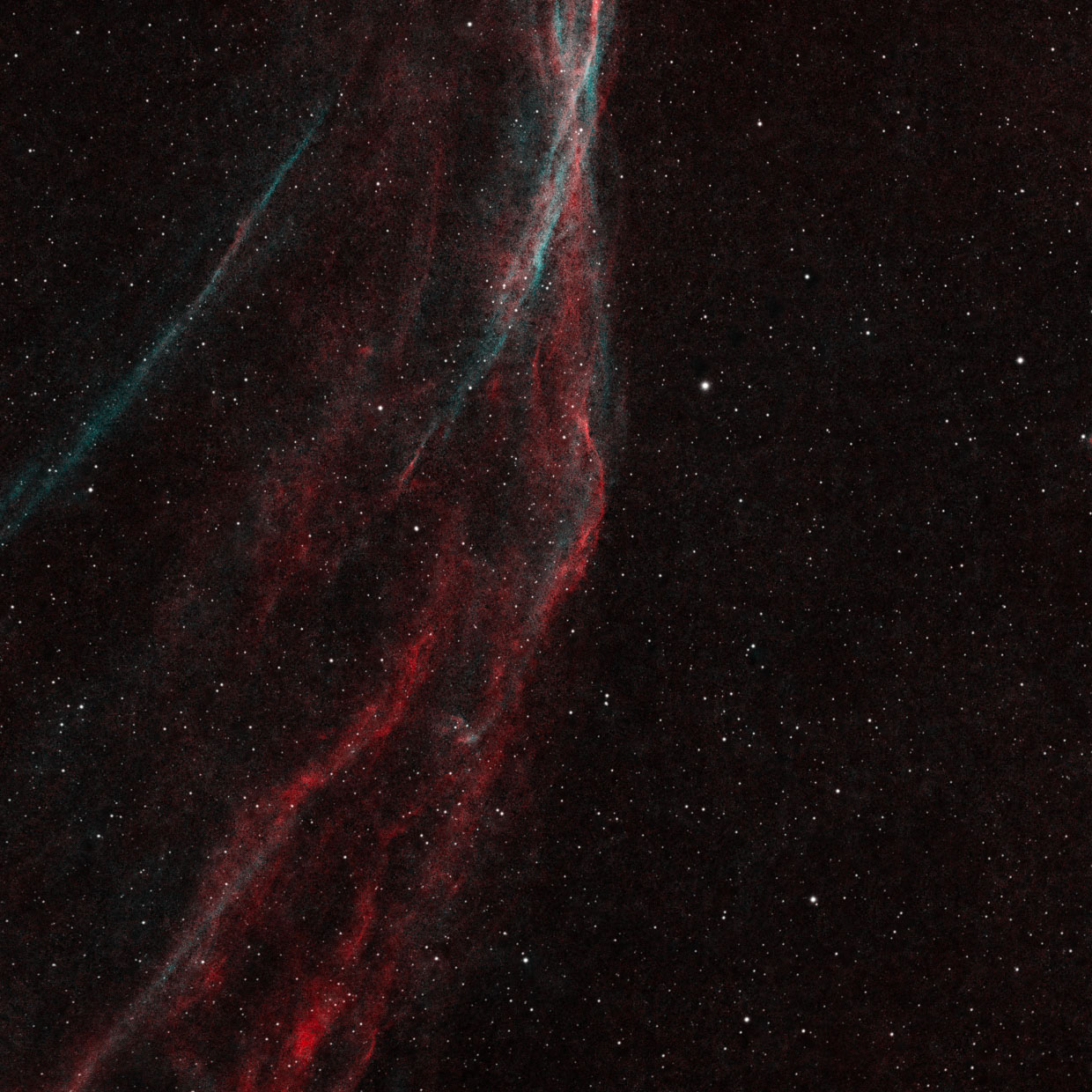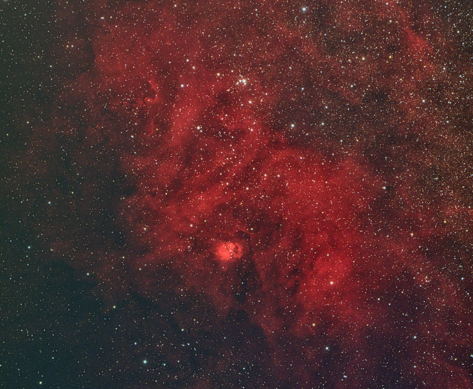 Die OIII Daten des vorhergehenden Bildes haben mich ermutigt eine Kombination mit einer älteren Halpha Aufnahme zu versuchen. Die Struktur der OIII Blase um NGC 6888 ist deutlich zu erkennen.