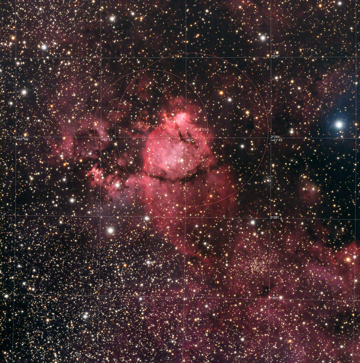 NGC 896, er wird auch als Fischkopf Nebel bezeichnet, liegt nordwestlich vom Herz Nebel (IC 1805) im Perseus Arm der Milchstraße im Sternbild Cassiopeia. Die Emissionen des Nebels sind in Halpha stark, in OIII jedoch eher schwach. Teleskop Veloce RH200, Kamera ASI 533 MM, 15 x 120s L, jeweisl 10 x 120 s R,G und B, jeweils 10 x 300s Halpha und OIII.. Hier die LRGB Kombination. Norden ist links