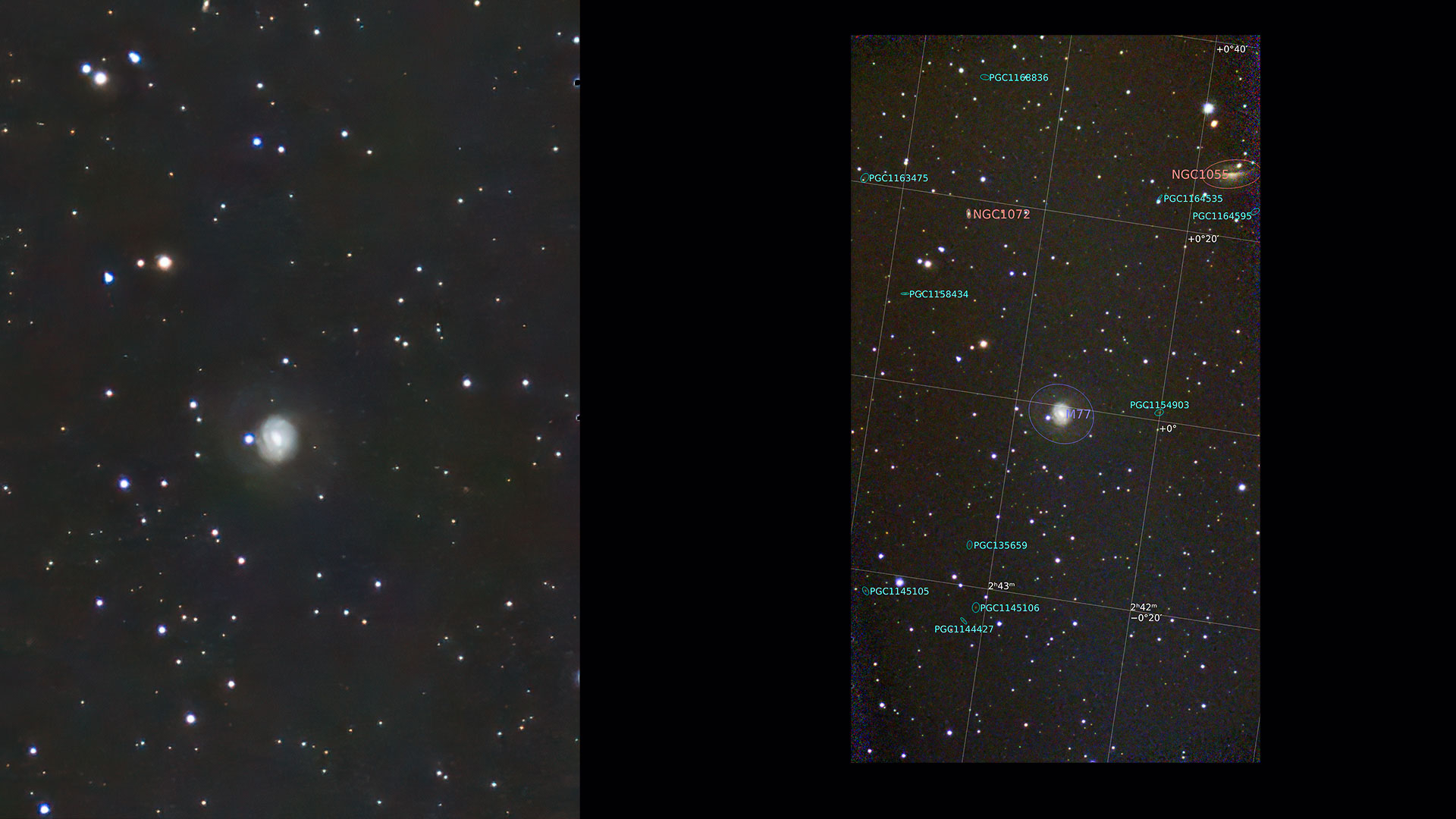 Messier 77 aka Cetus A, Seiyfert Galaxie im Walfisch, S50 244 x 10s, Crop und Übersicht annotiert, PI + PS