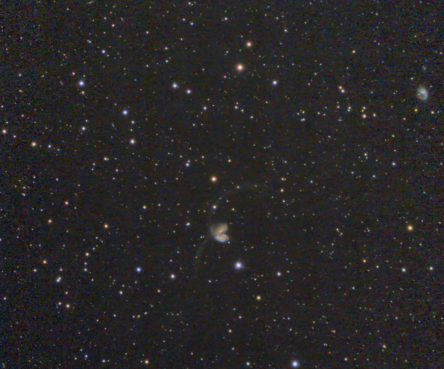 Noch einmal die Antennen Galaxien NGC 4038 und 4039 mit dem Seestar Mosaik Modus aufgenommen und mit Siril gestackt. Rechts oben ist die Galaxie NGC 4027. S 50, 651 x 10s.